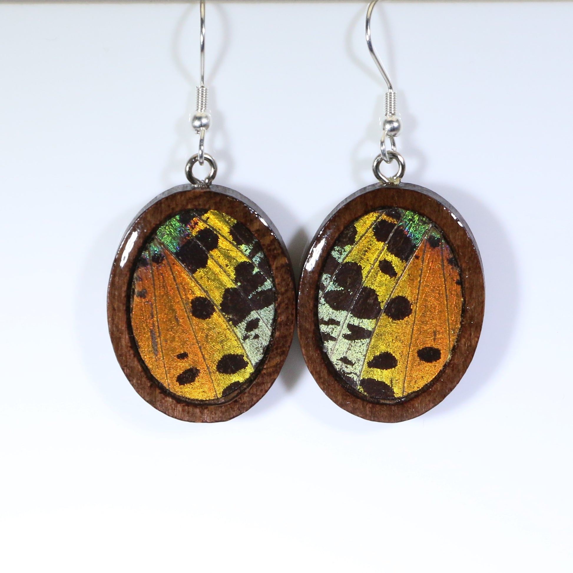51702 - Real Butterfly Wing Jewelry - Earrings - Medium - Dark Wood - Oval - Plain - Sunset Moth - Orange