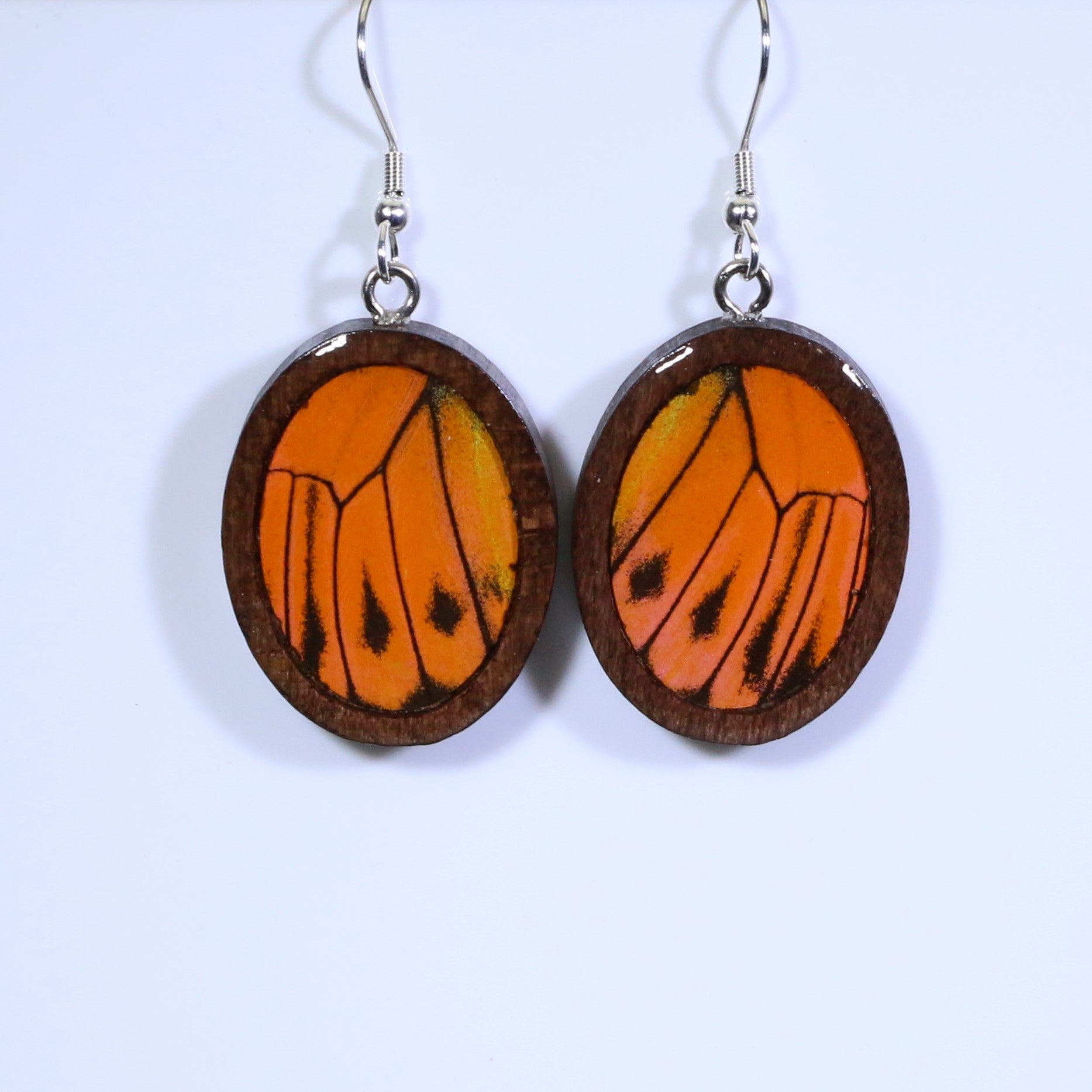 51705 - Real Butterfly Wing Jewelry - Earrings - Medium - Dark Wood - Oval - Plain - Hebomia - Orange