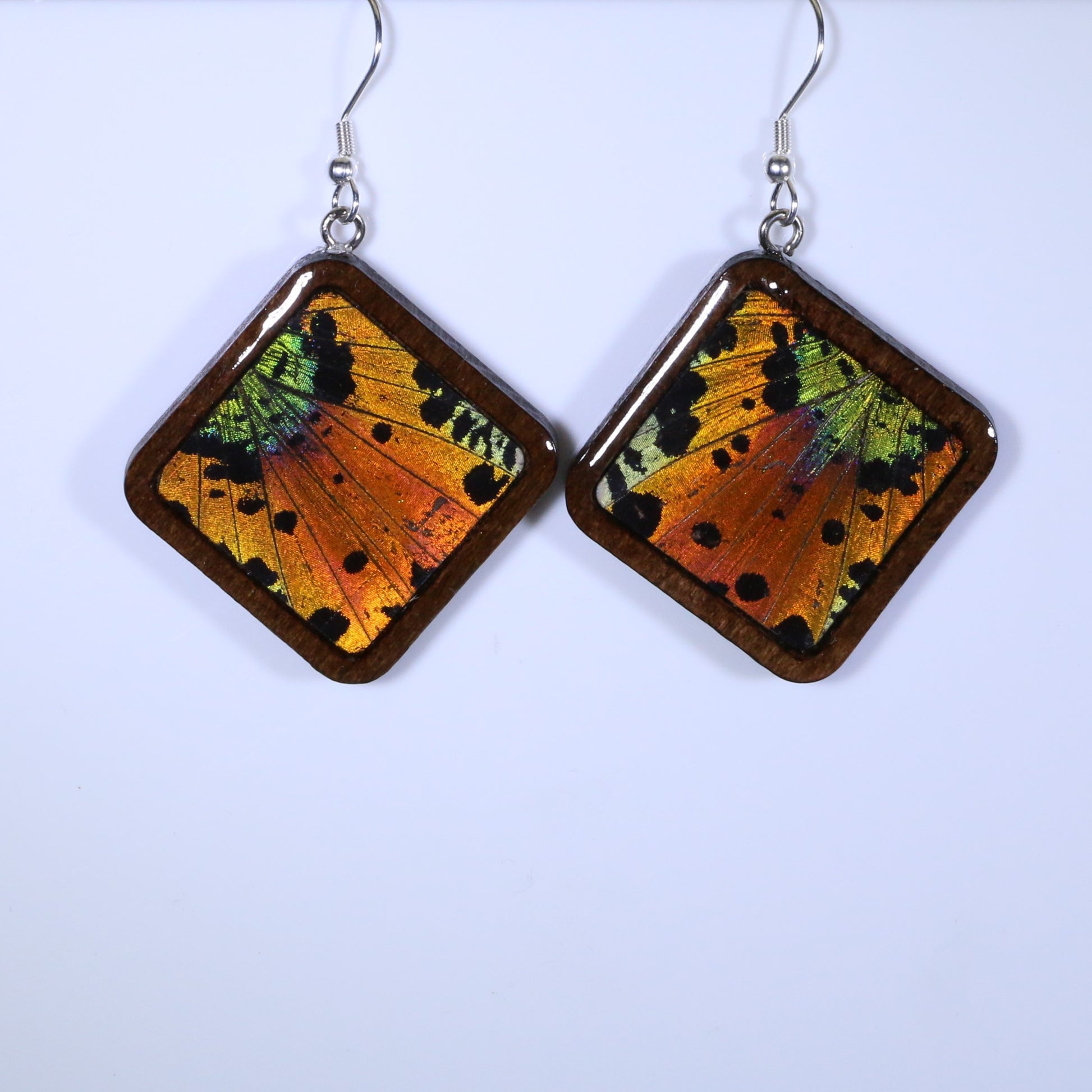 51852 - Real Butterfly Wing Jewelry - Earrings - Large - Dark Wood - Diamond Shape - Sunset Moth - Orange