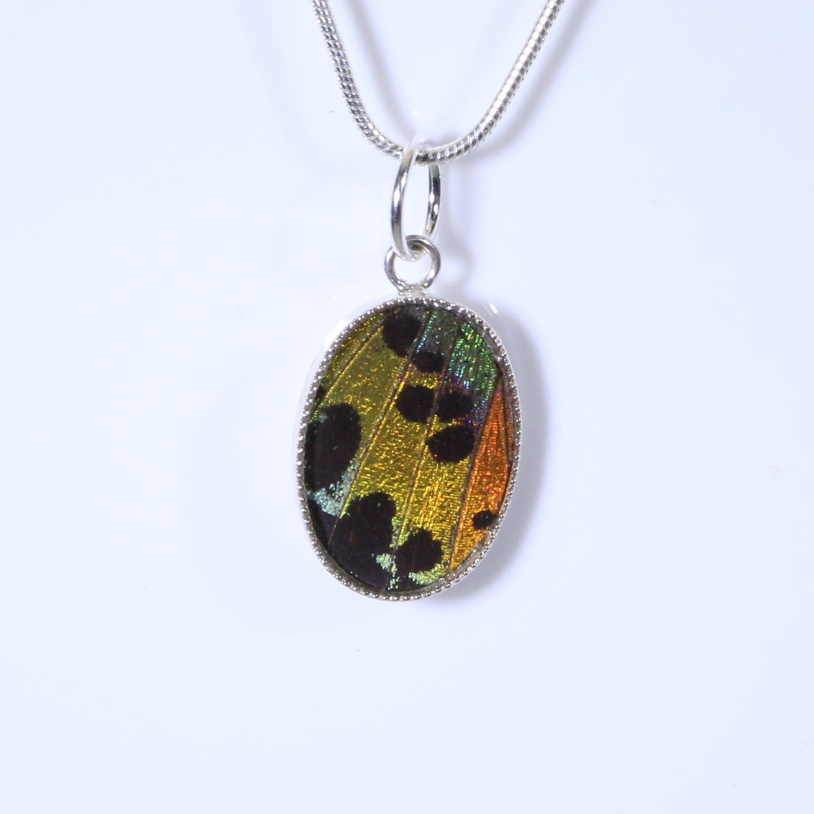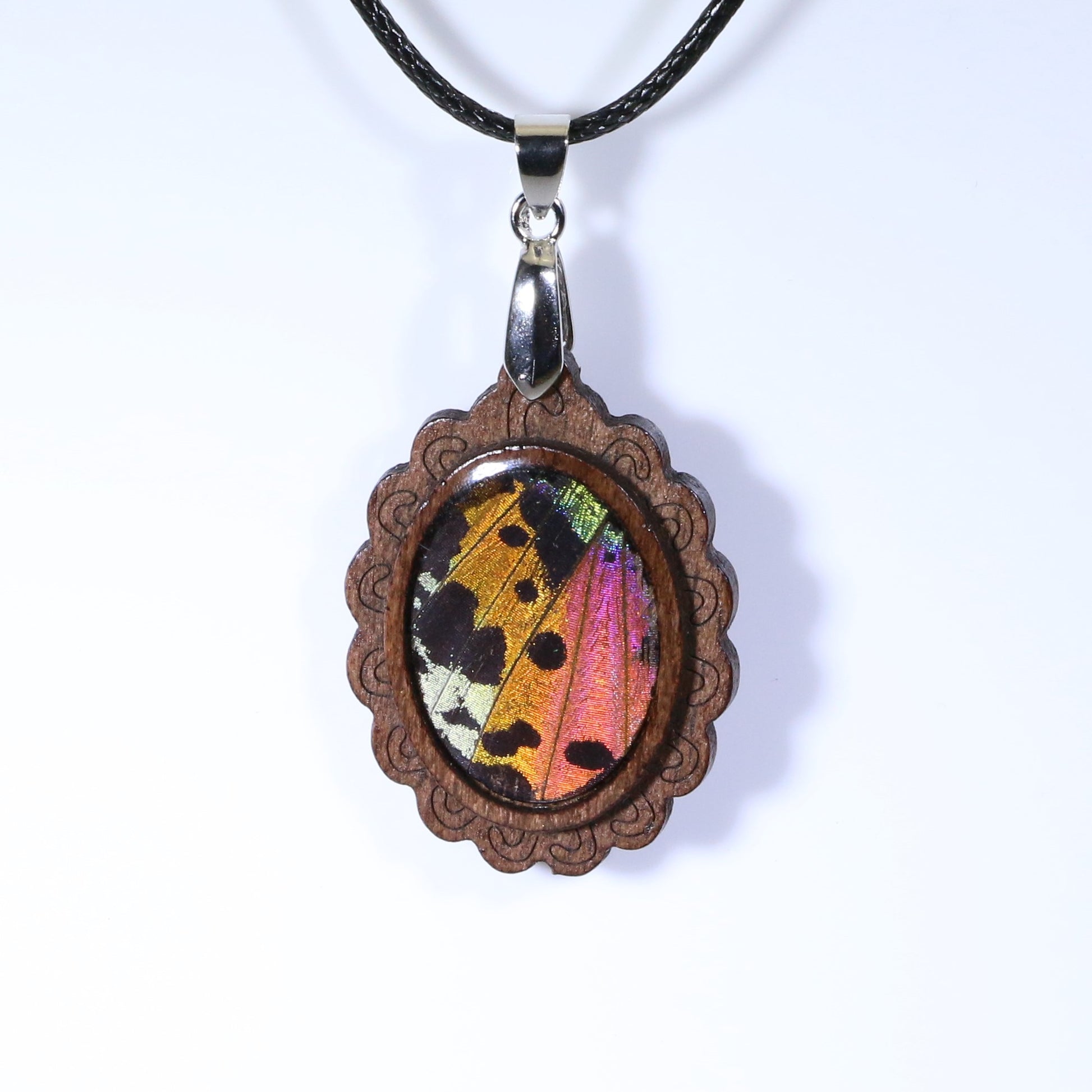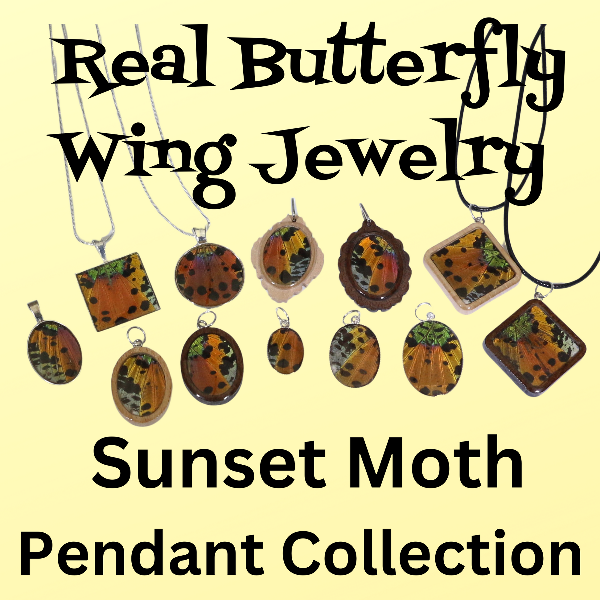 Discover the unique beauty of the 52002 Real Butterfly Wing Jewelry Pendant Collection from Madagascar. Our collection features the stunning Sunset Moth, a rare day time flying moth renowned for its impressive and colorful display. Crafted with the world's most vibrant butterfly wings, this exquisite jewelry adds a luxurious touch of nature to any outfit.