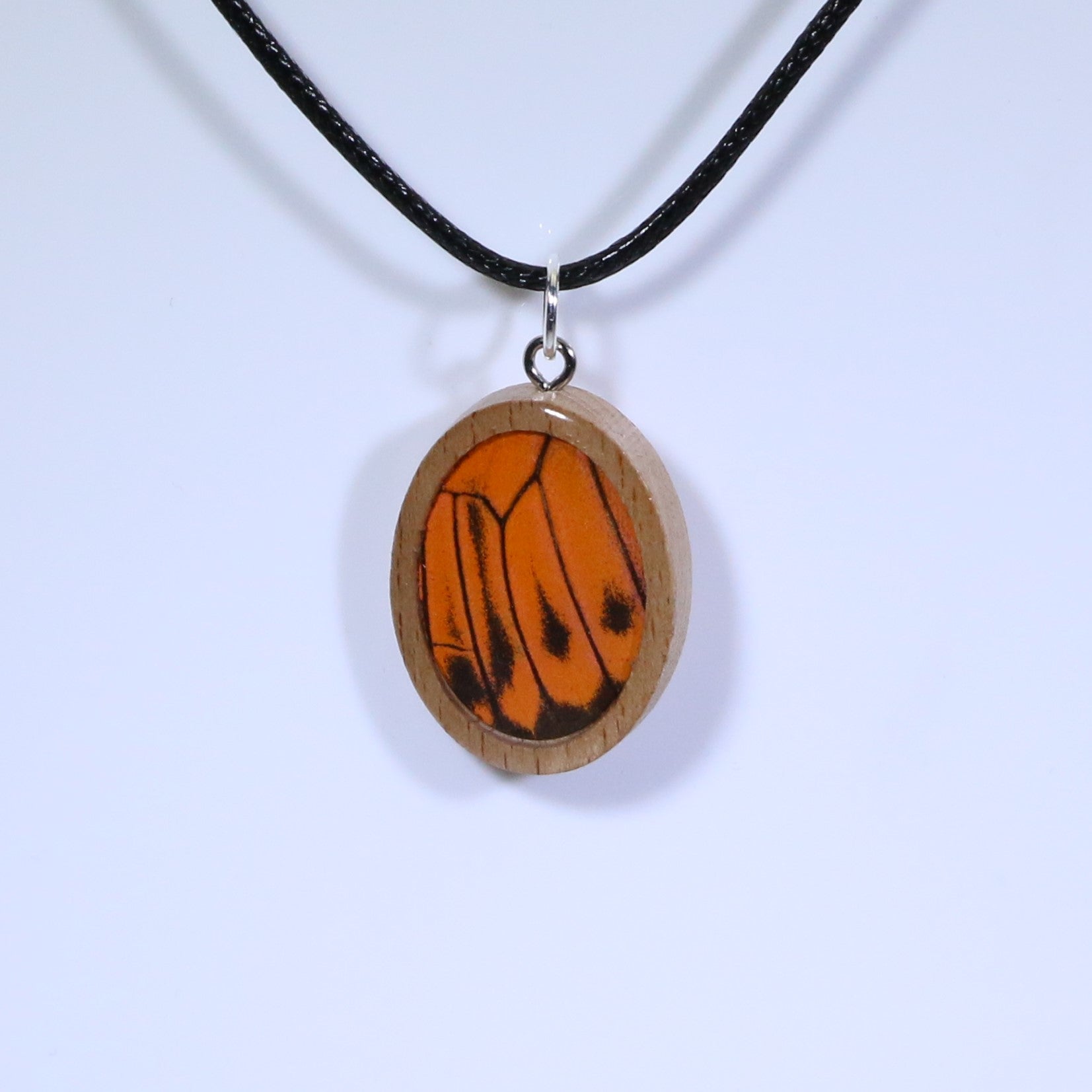 52605 - Real Butterfly Wing Jewelry - Pendant - Tan Wood - Oval - Plain - Hebomia - Orange