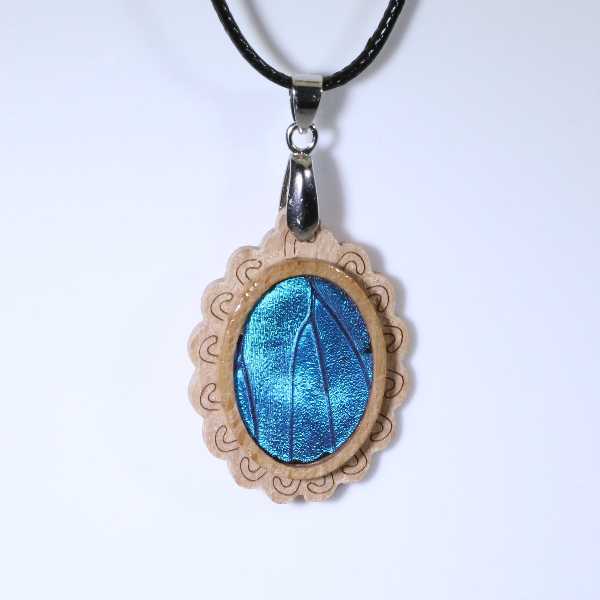 52701 - Real Butterfly Wing Jewelry - Pendant - Tan Wood - Oval - Filigree - Blue Morpho