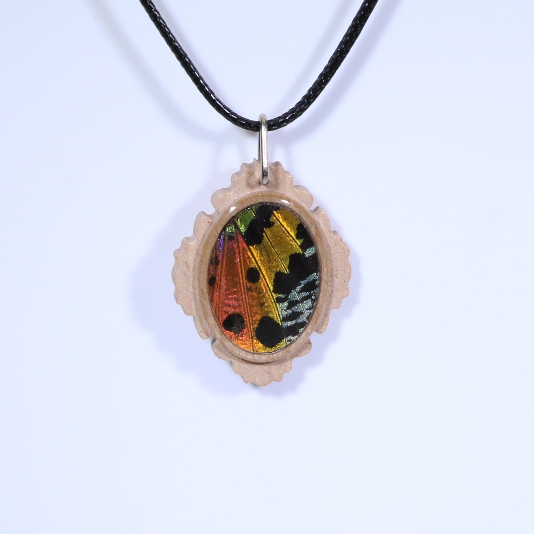 52702 - Real Butterfly Wing Jewelry - Pendant - Tan Wood - Oval - Filigree - Sunset Moth - Orange