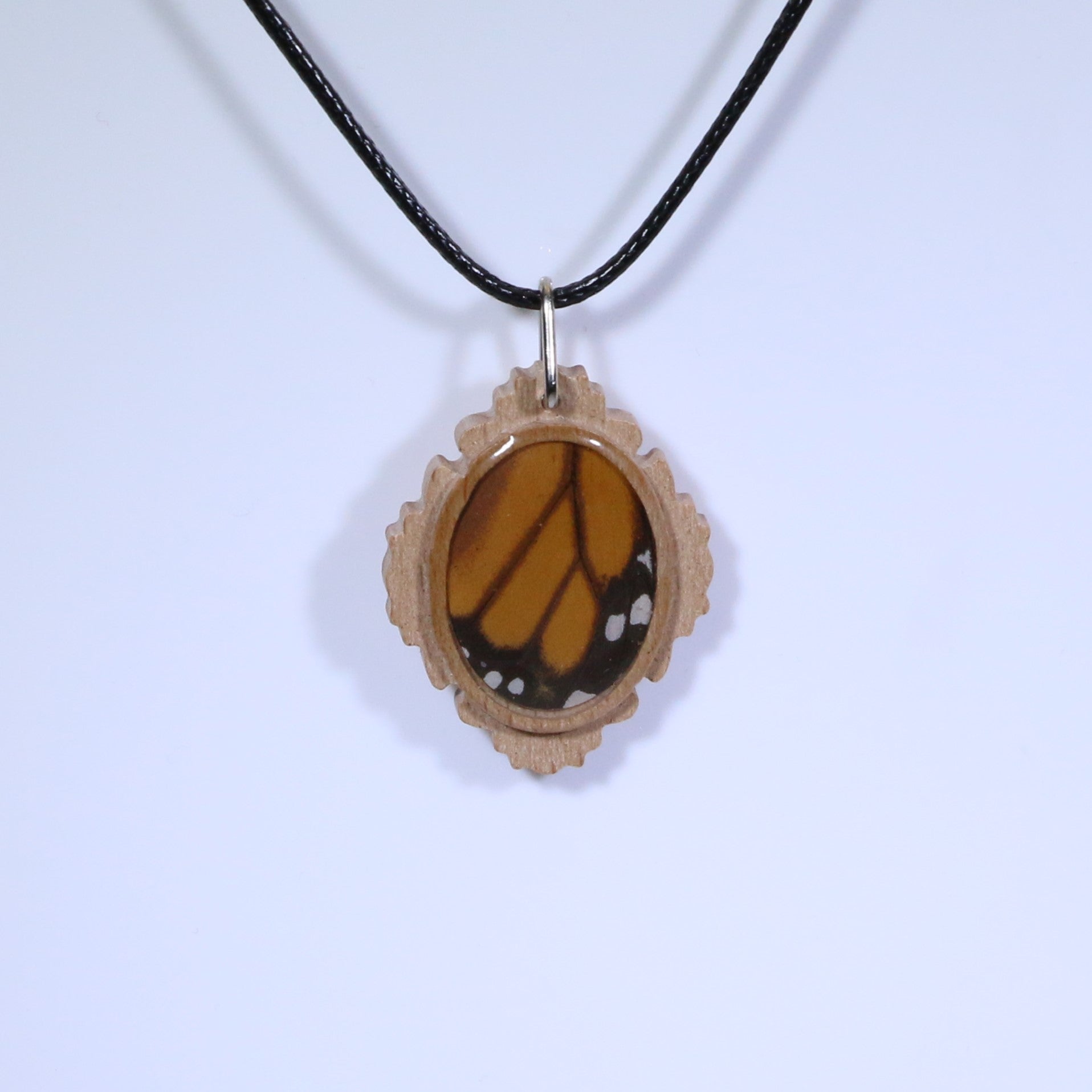 52704 - Real Butterfly Wing Jewelry - Pendant - Tan Wood - Oval -Filigree - Monarch