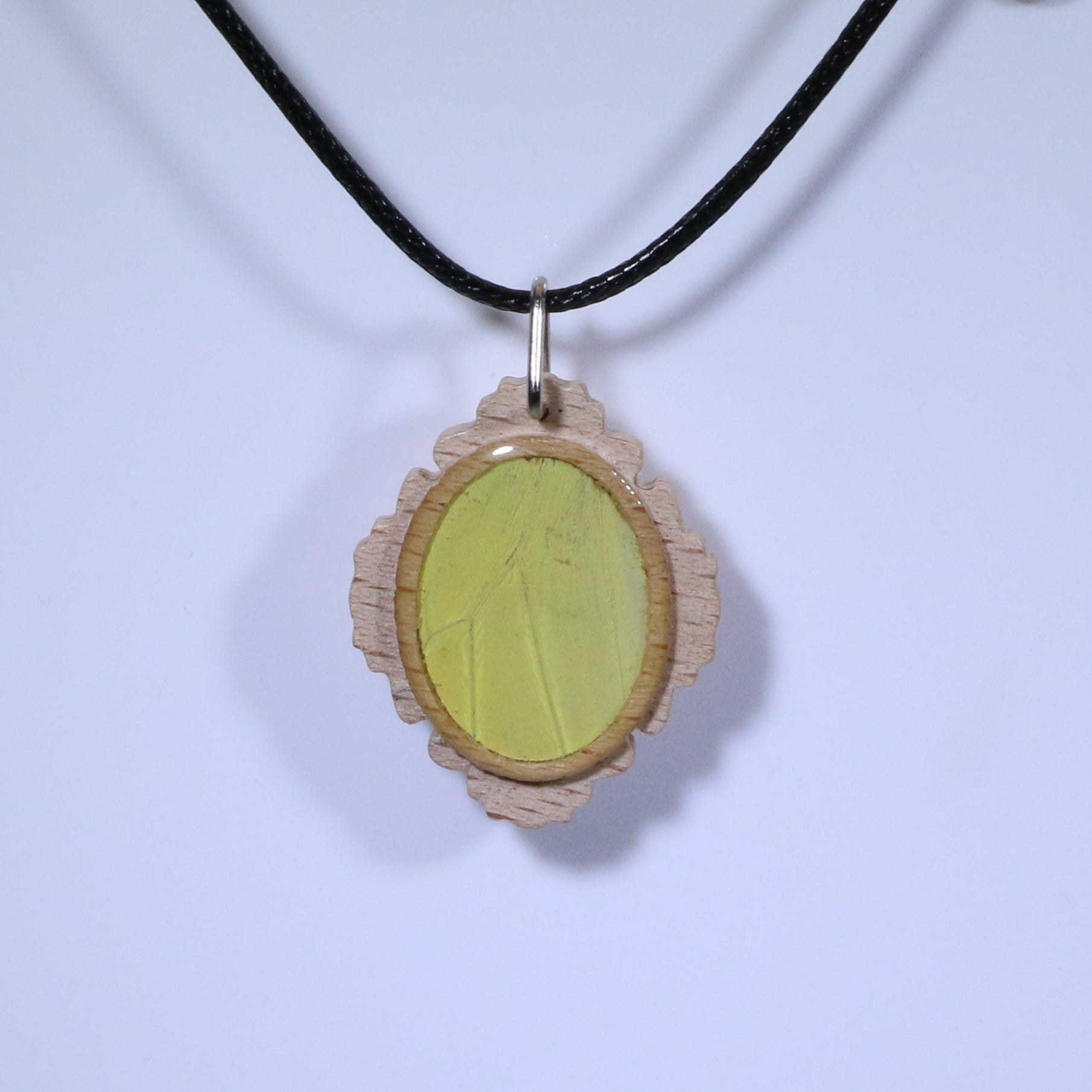 52706 - Real Butterfly Wing Jewelry - Pendant - Tan Wood - Oval - Filigree - Hebomia - Yellow