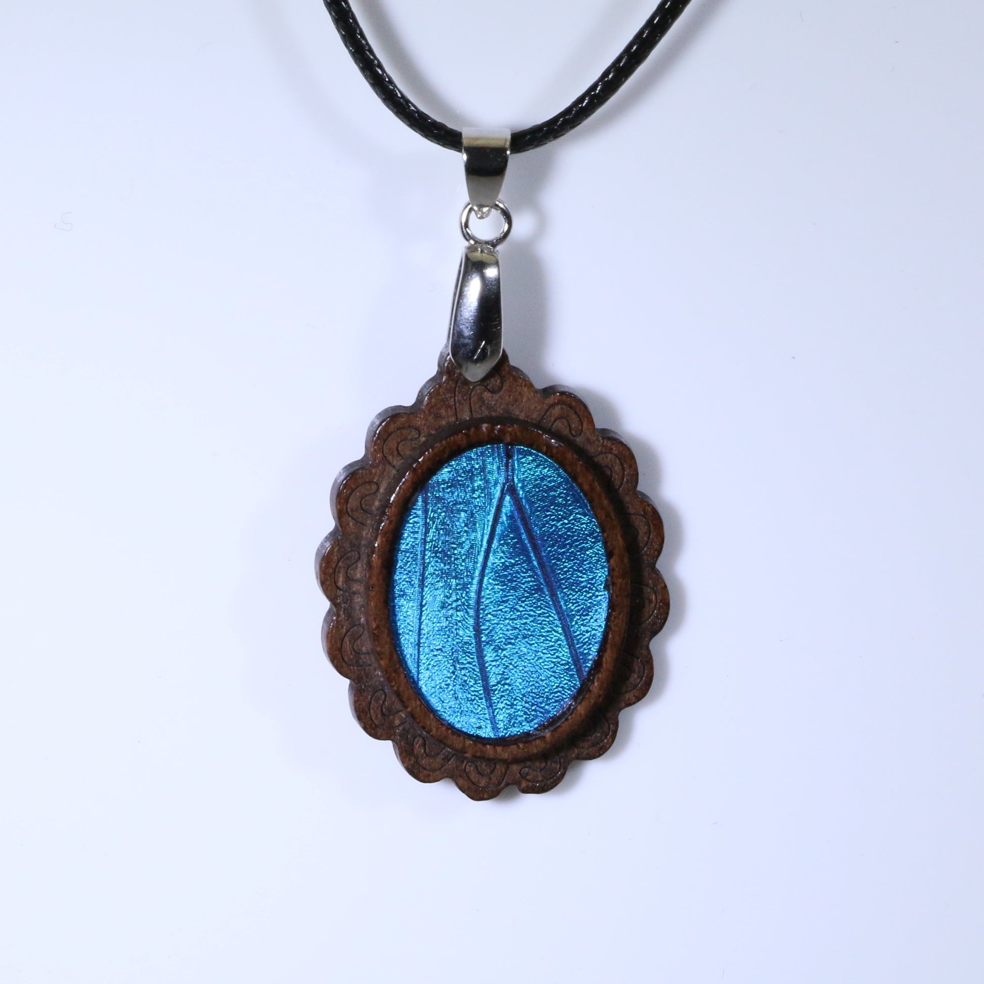 52711 - Real Butterfly Wing Jewelry - Pendant - Dark Wood - Oval - Filigree - Blue Morpho