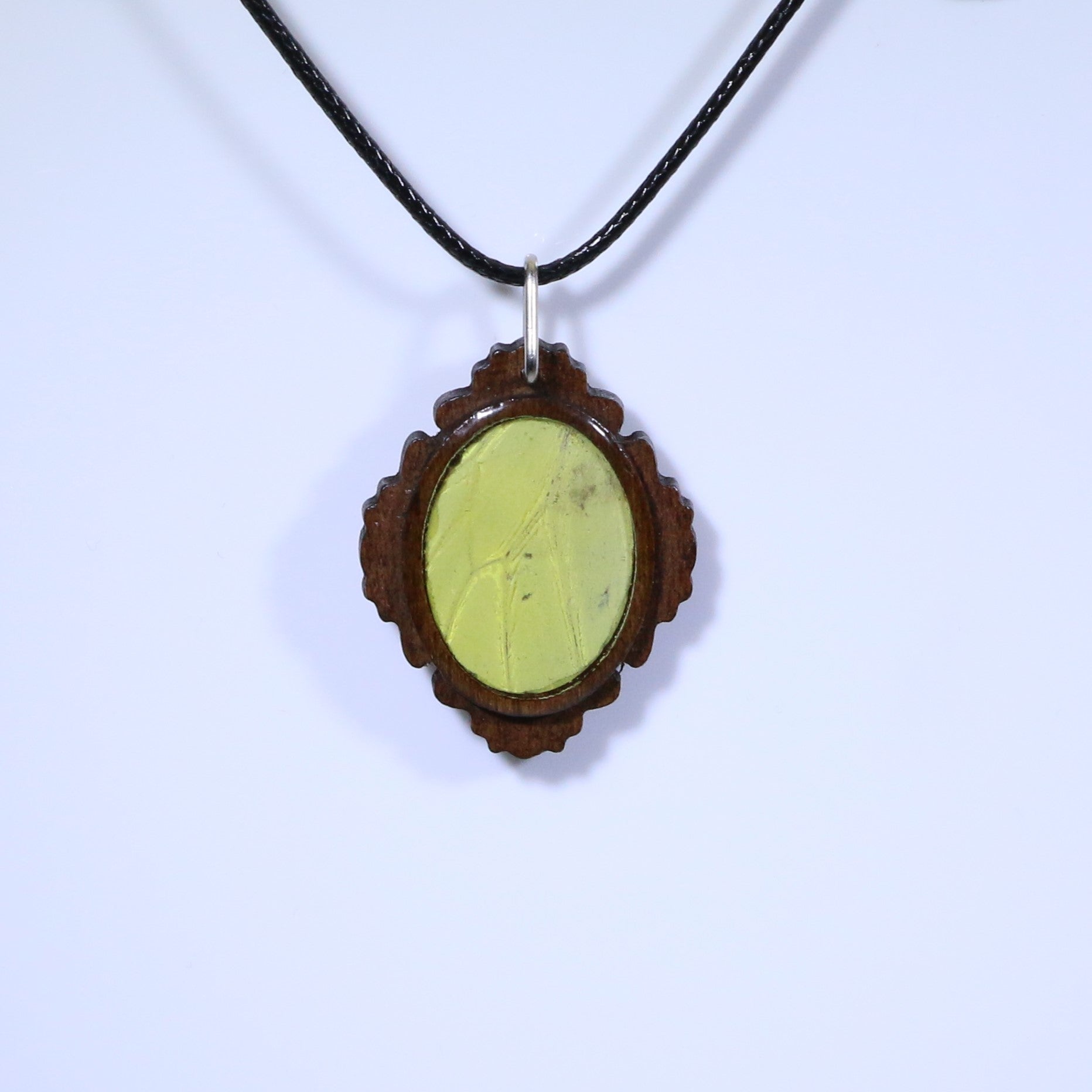 52716 - Real Butterfly Wing Jewelry - Pendant - Dark Wood - Oval - Filigree - Hebomia - Yellow