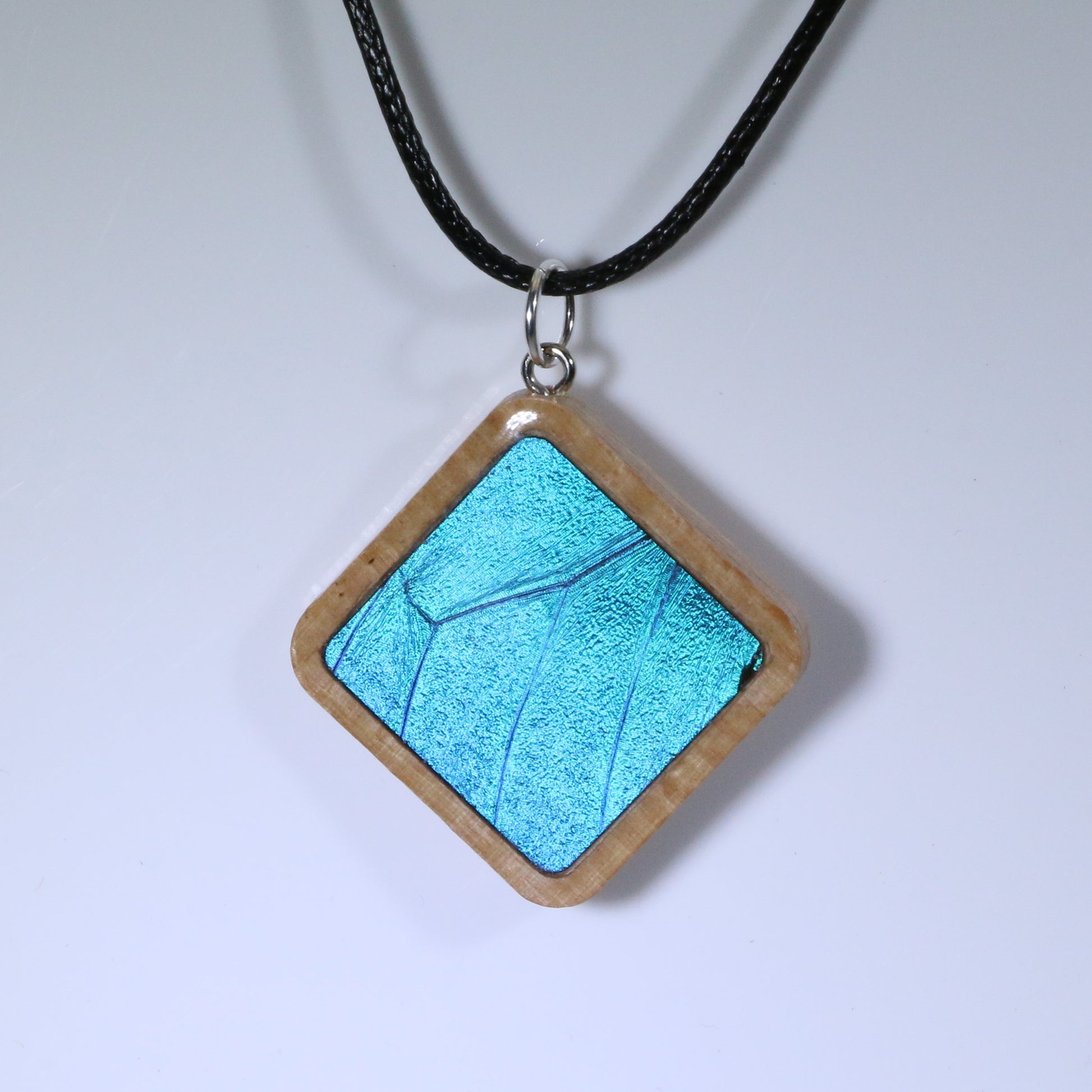 52901 - Real Butterfly Wing Jewelry - Pendant - Tan Wood - Large - Diamond Shape - Blue Morpho