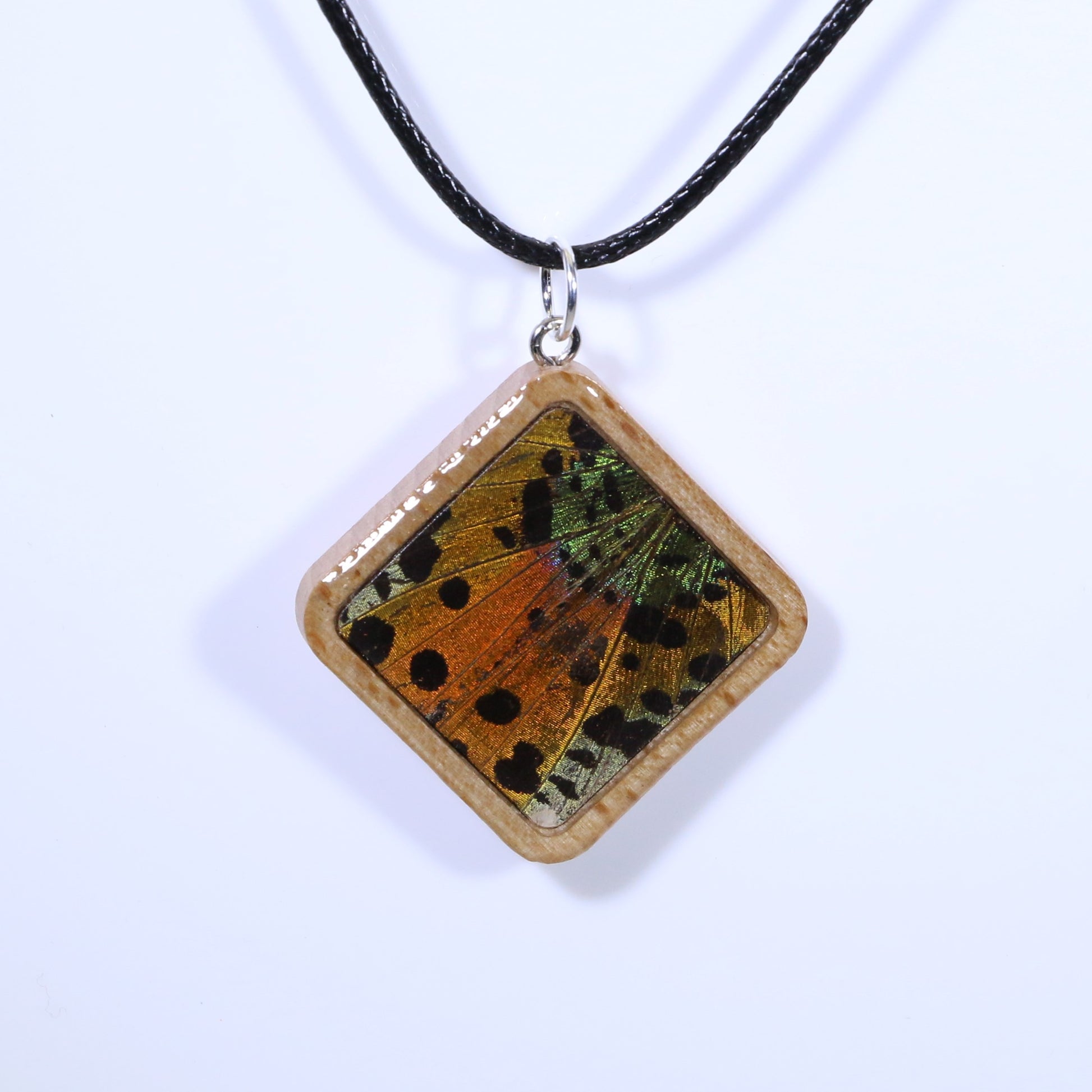 52902 - Real Butterfly Wing Jewelry - Pendant - Tan Wood - Large - Diamond Shape - Sunset Moth - Orange
