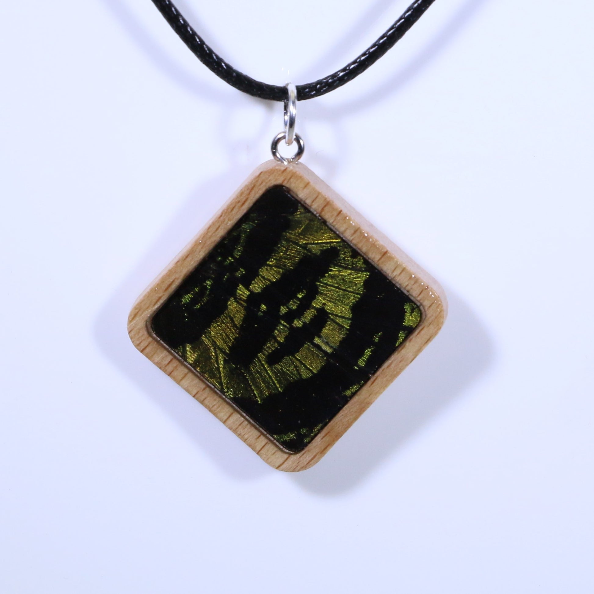 52903 - Real Butterfly Wing Jewelry - Pendant - Tan Wood - Large - Diamond Shape - Sunset Moth - Green