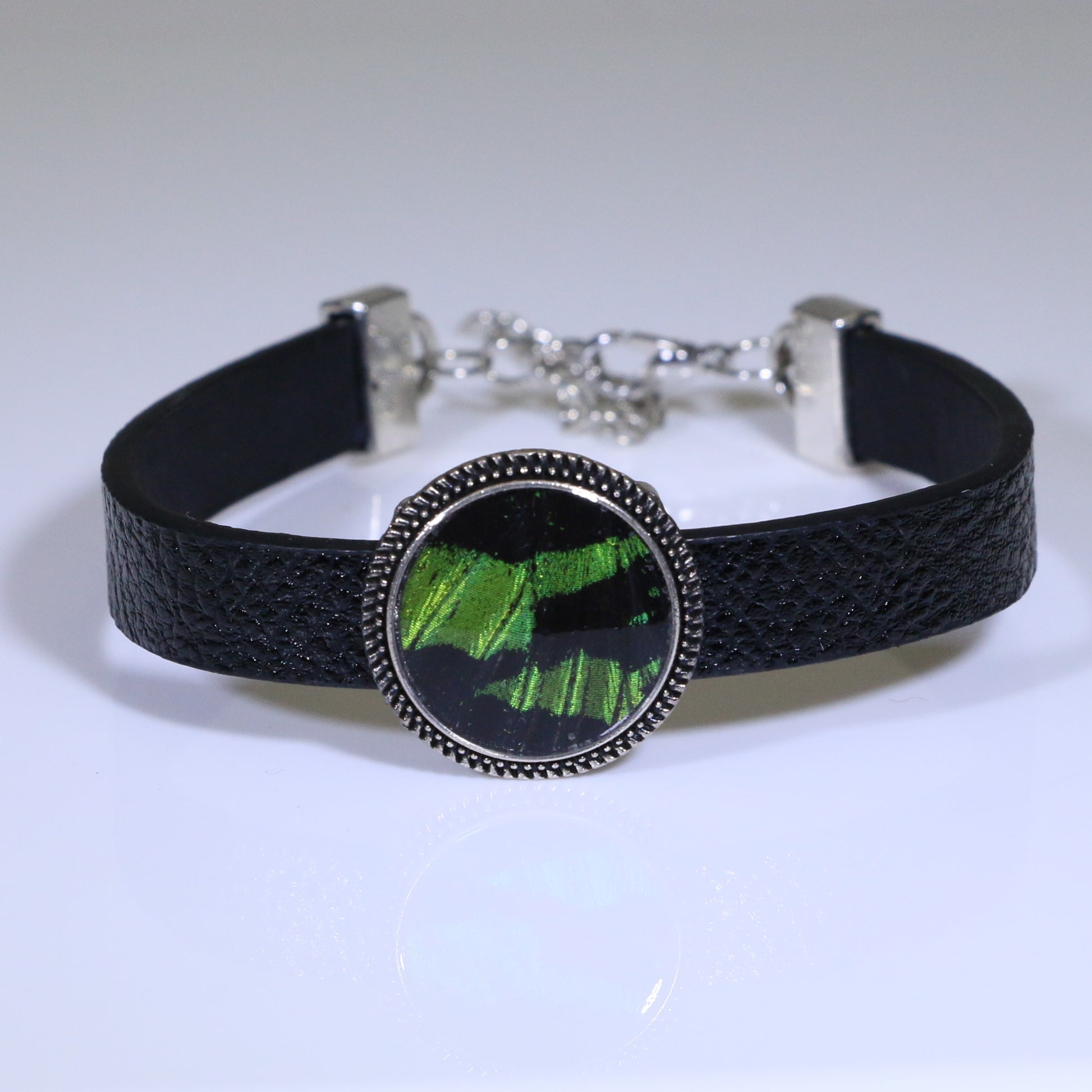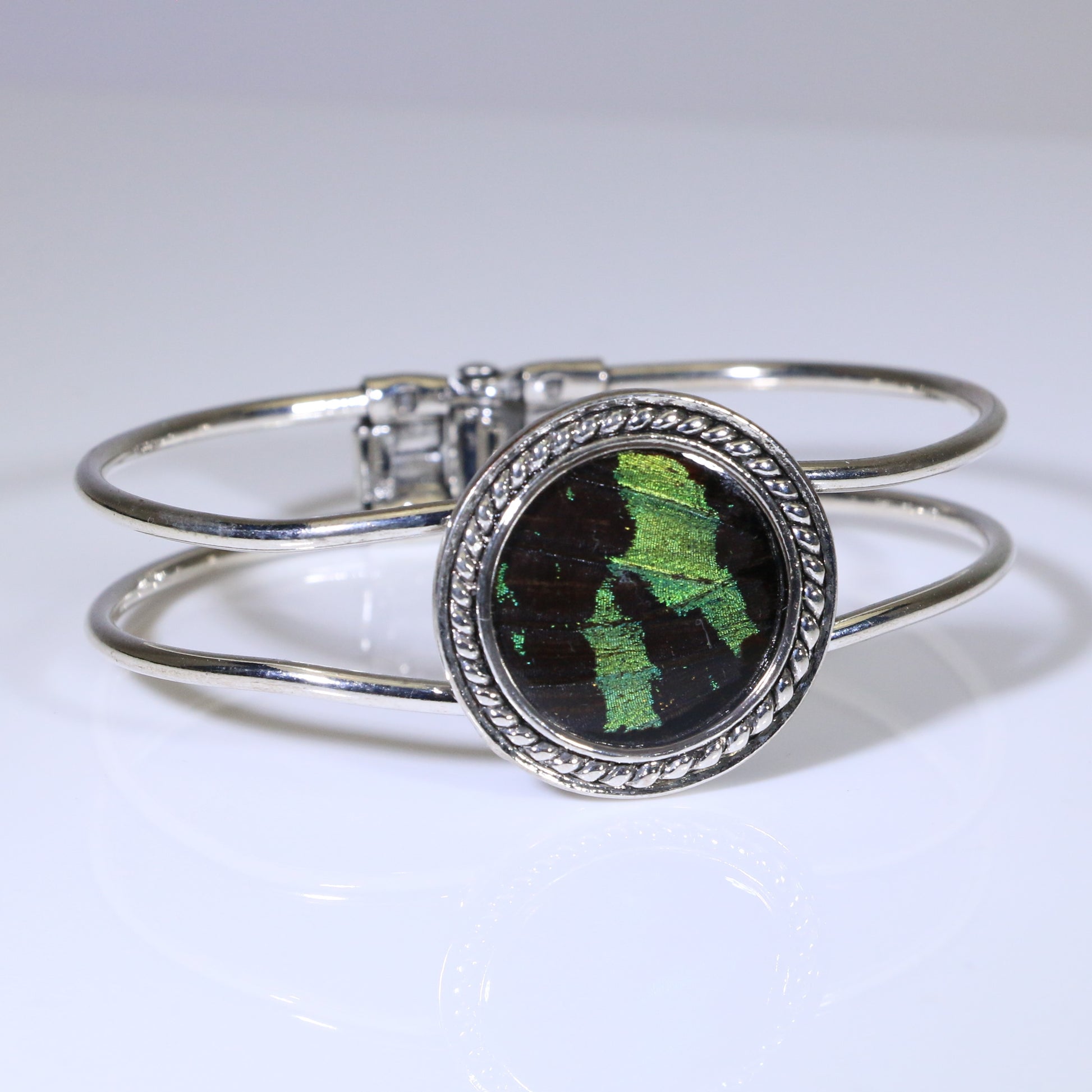 Stand out from the crowd with this unique piece of jewelry made from real Madagascar Sunset Moth wings in emerald green. Accessorize your look with this stunning bracelet for a touch of adventure and risk-taking. Dare to be different!