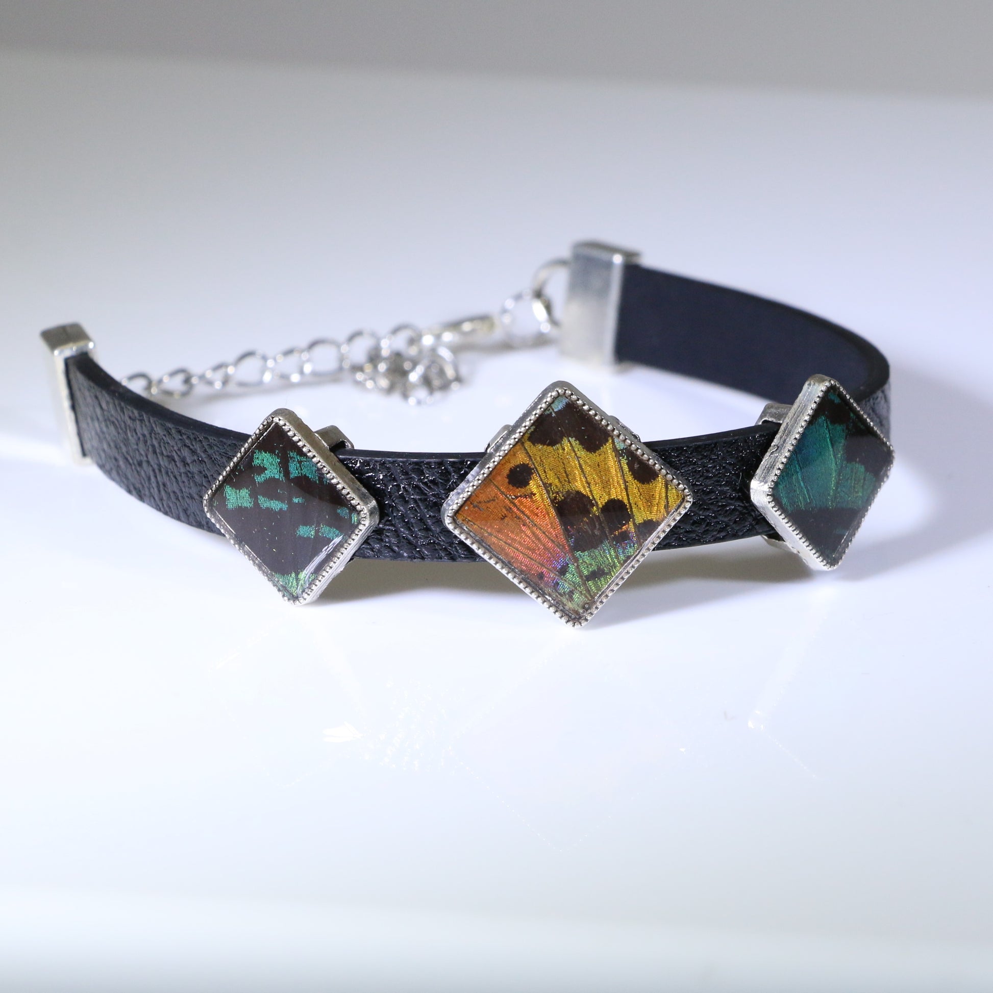 53602 - Real Butterfly Wing Jewelry - Bracelet - 3 Settings - 1 Large - 2 Small - Diamond Shape - Sunset Moth