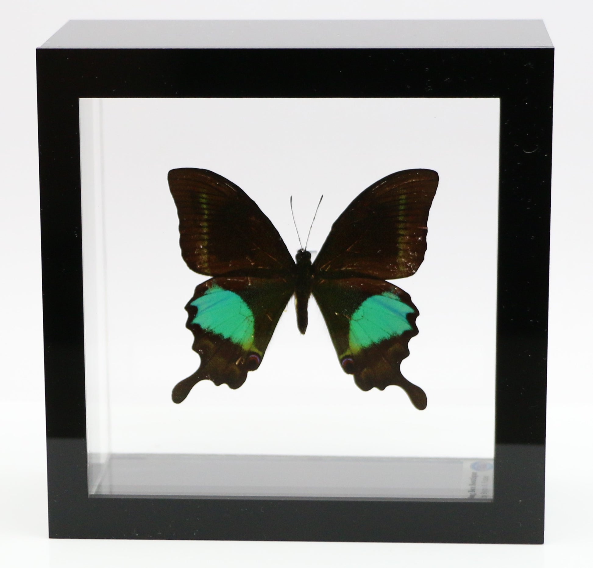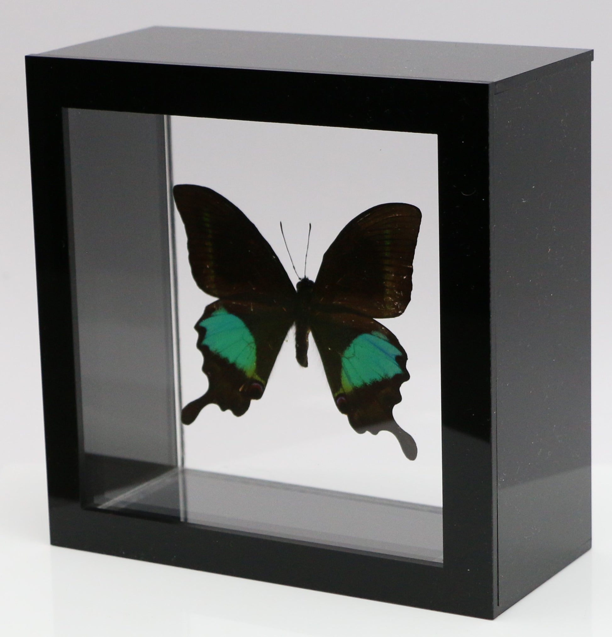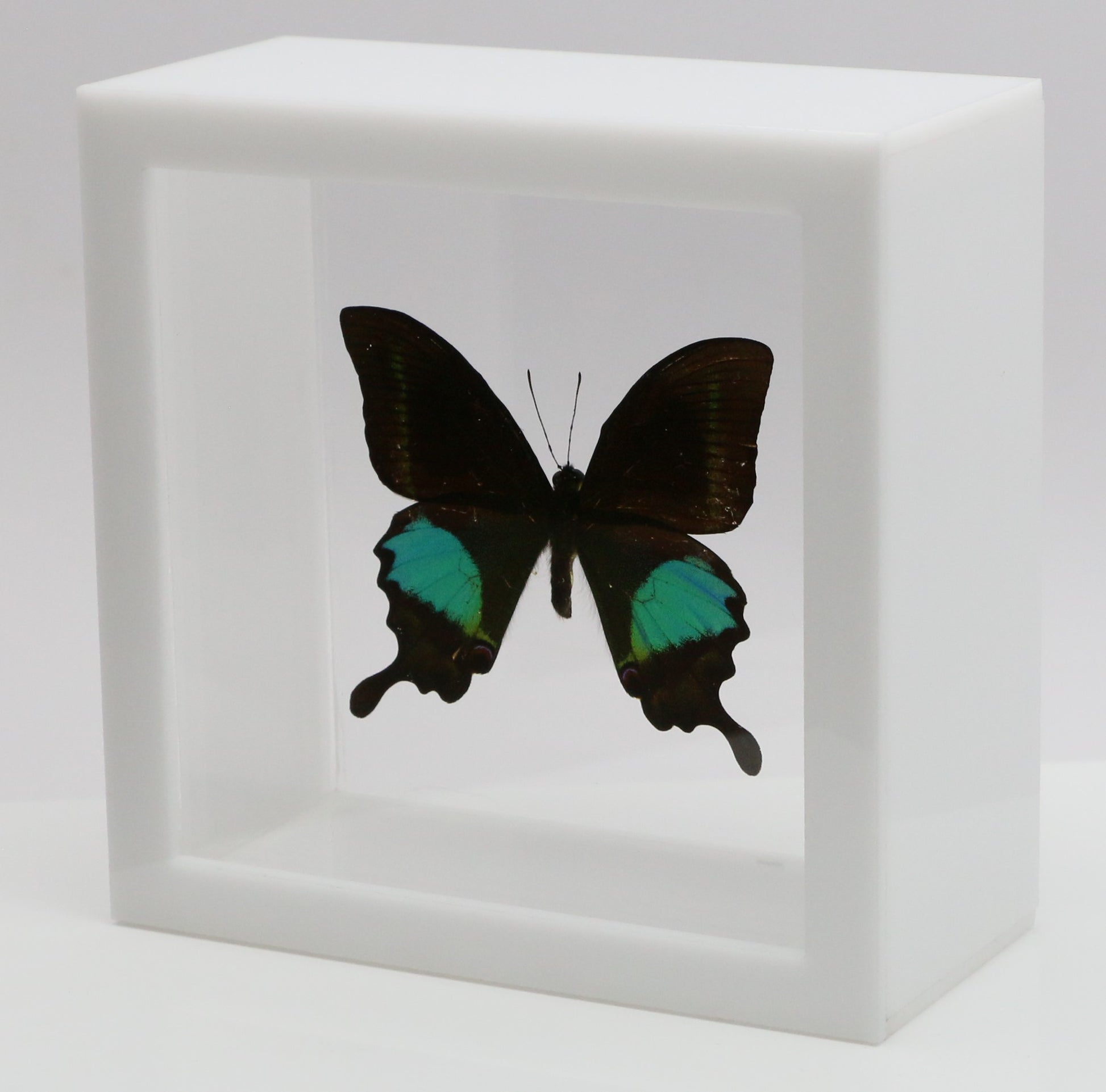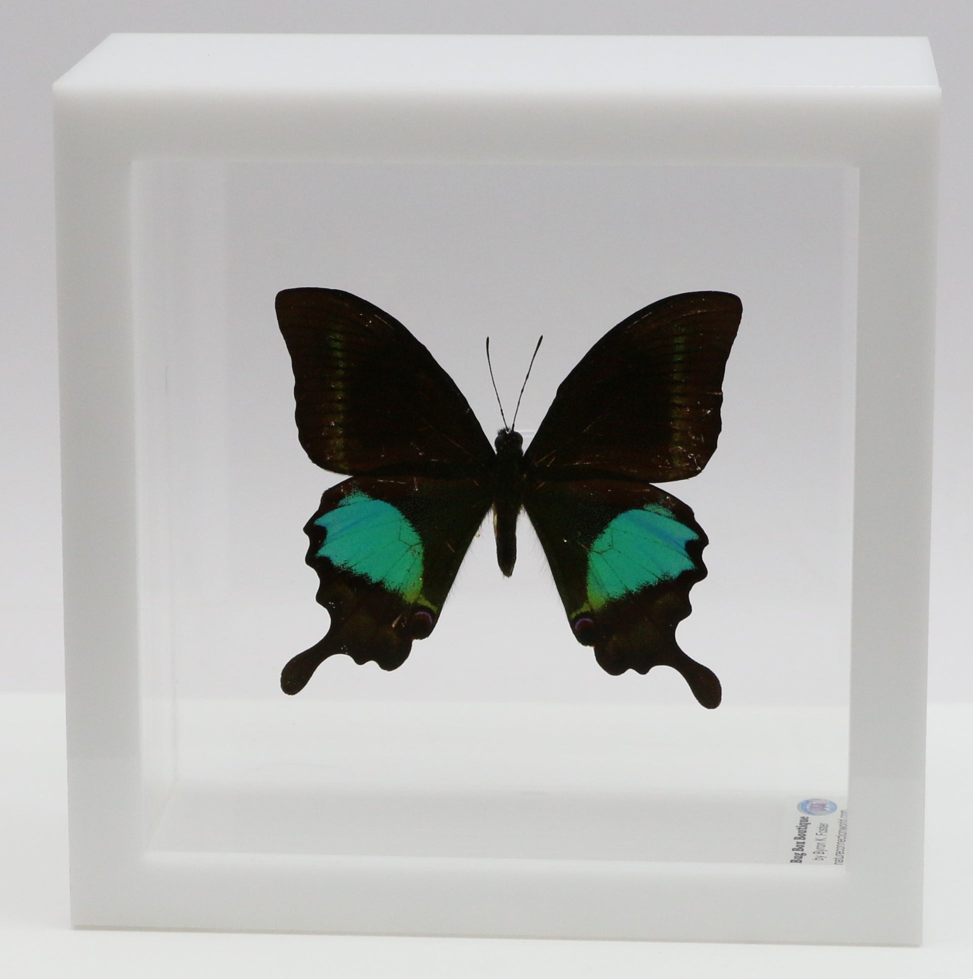 All of our acrylic display boxes are handcrafted at our facilities in Temple, TX. All displays include the species identification information and a packet of Novus acrylic polish. A keyhole hanger is attached so the box can be displayed either by setting on a surface or hanging. All of our specimens are ethically sourced from butterfly exhibits, butterfly farms and suppliers from around the world.