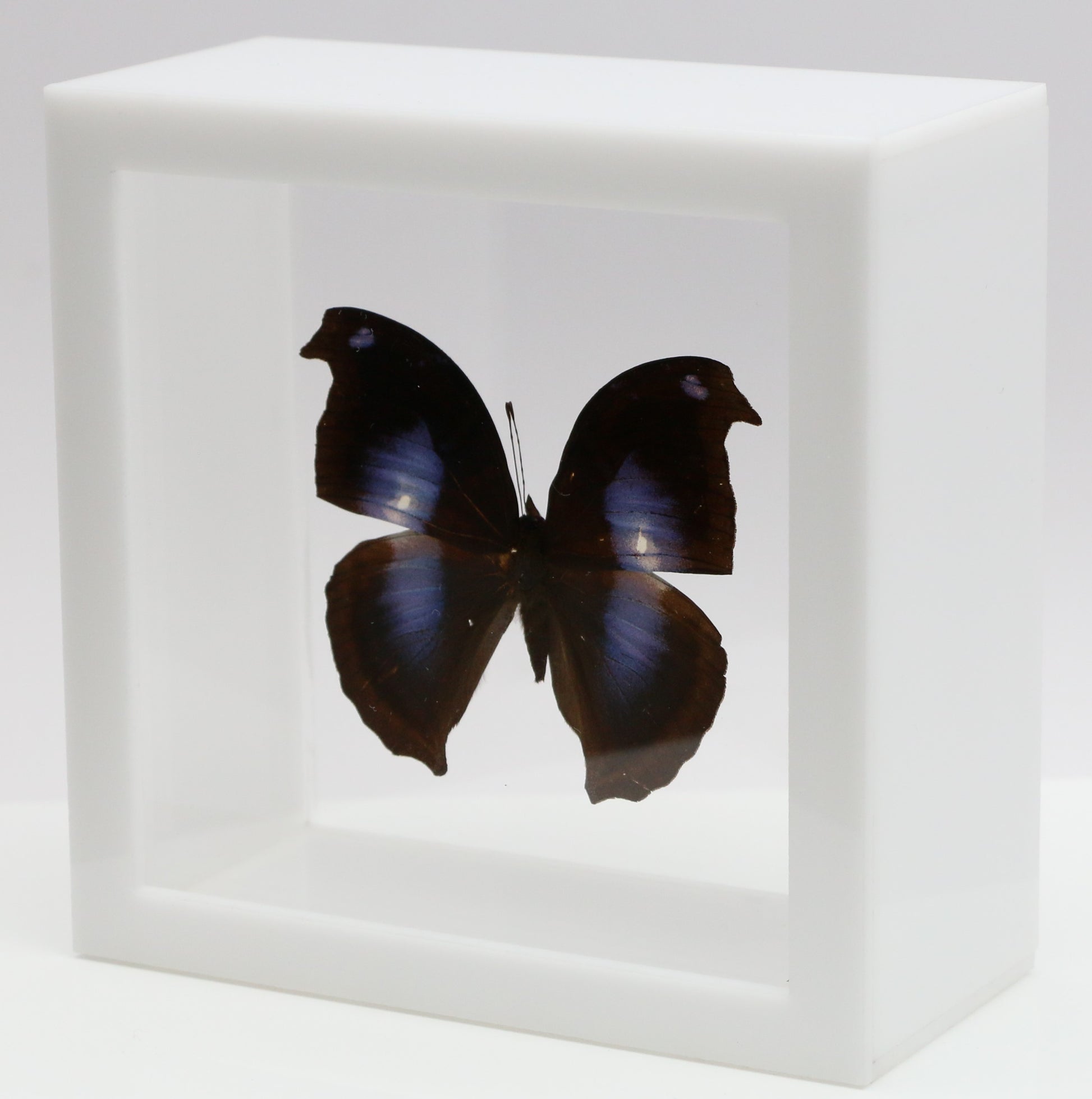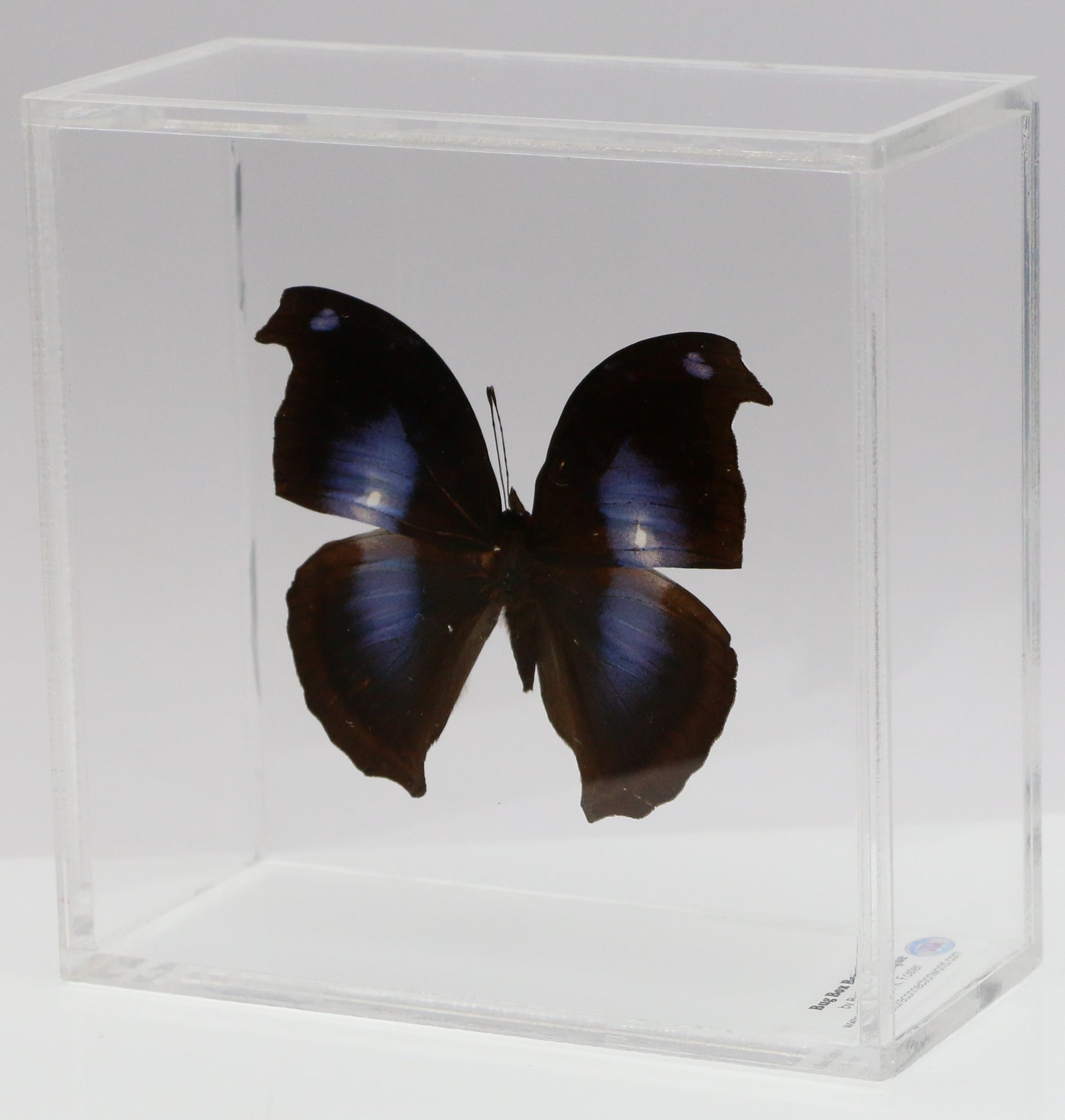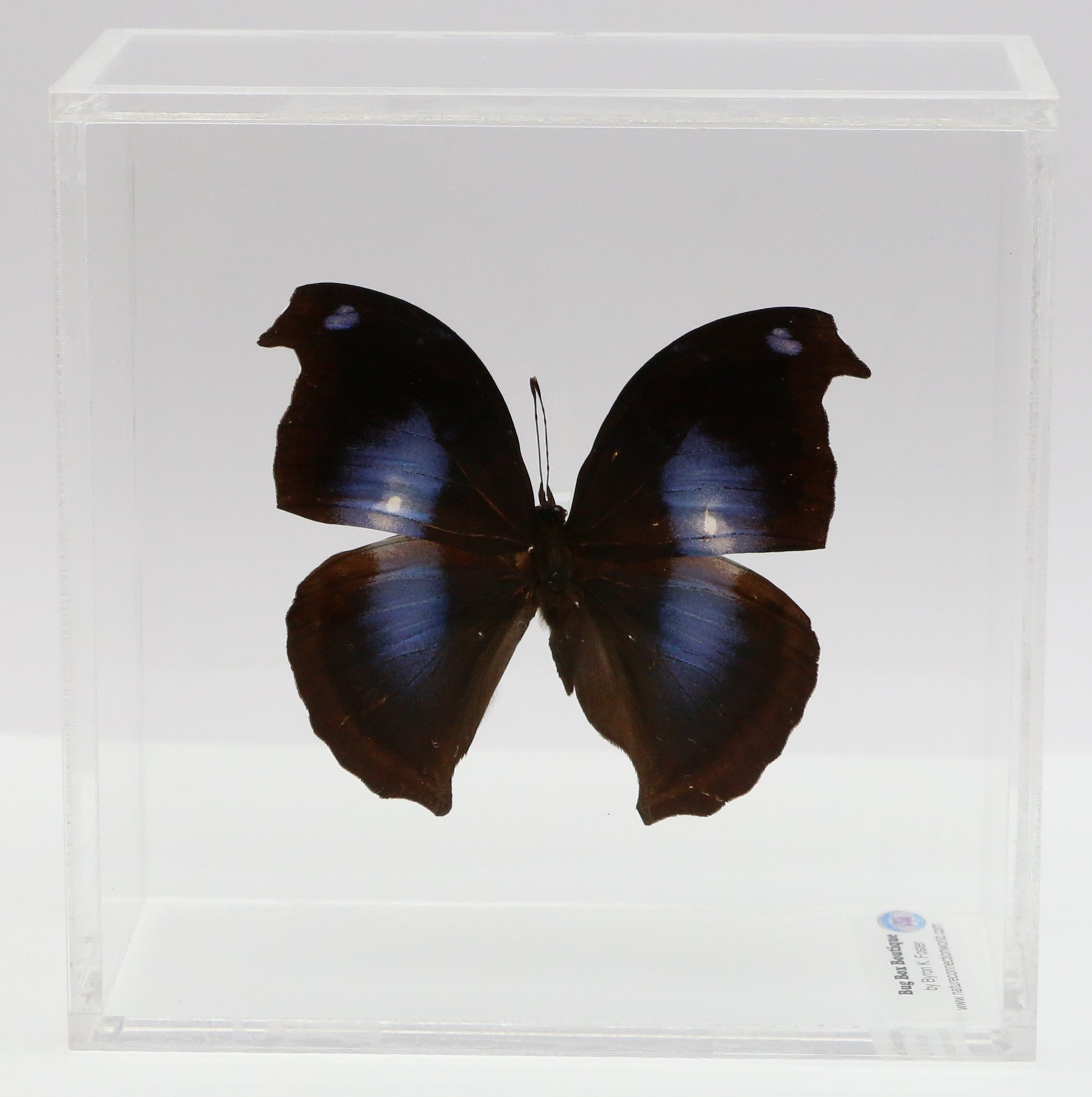 All of our acrylic display boxes are handcrafted at our facilities in Temple, TX. All displays include the species identification information and a packet of Novus acrylic polish. A keyhole hanger is attached so the box can be displayed either by setting on a surface or hanging. All of our specimens are ethically sourced from butterfly exhibits, butterfly farms and suppliers from around the world.