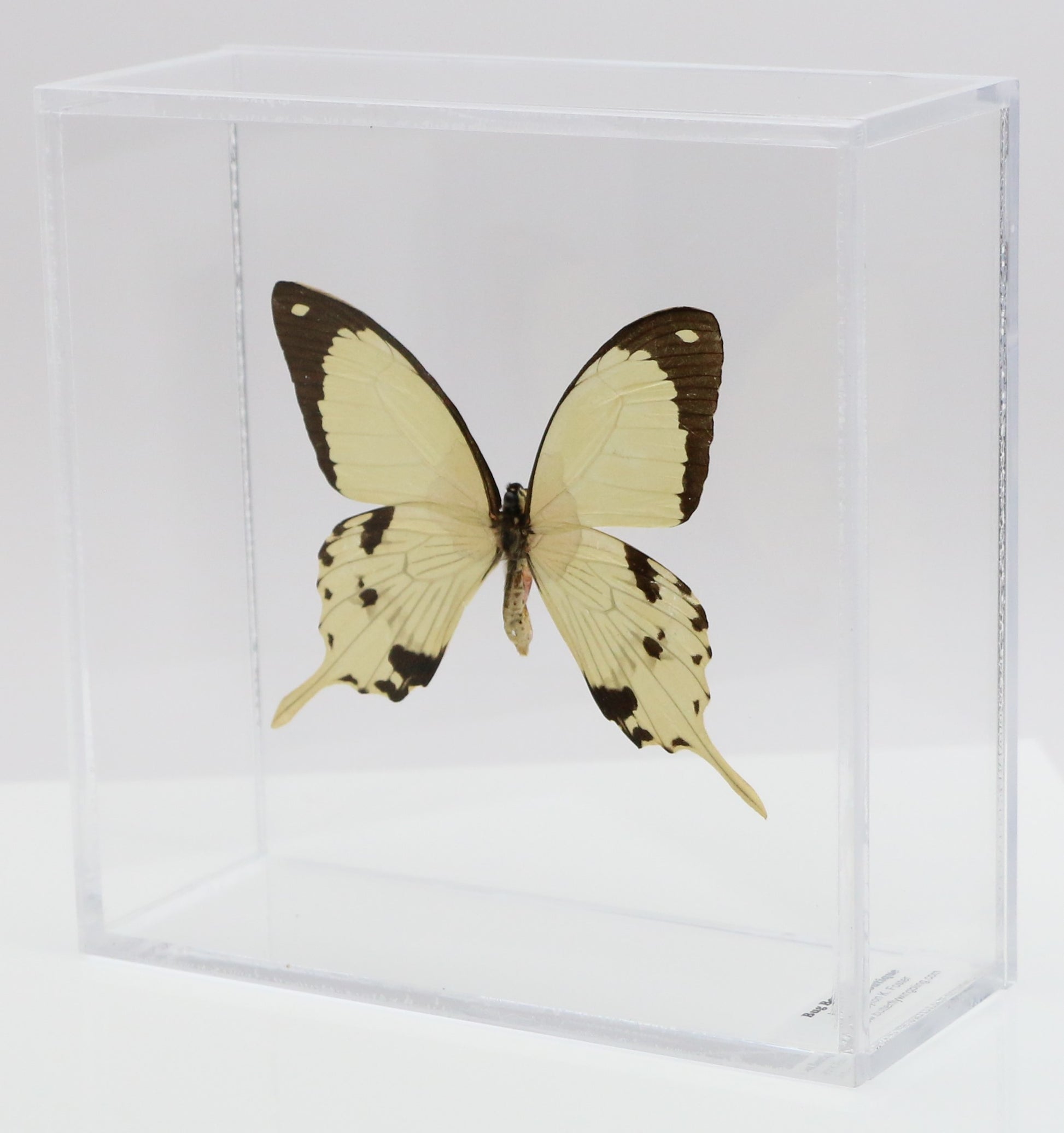 All of our acrylic display boxes are handcrafted at our facilities in Temple, TX. All displays include the species identification information and a packet of Novus acrylic polish. A keyhole hanger is attached so the box can be displayed either by setting on a surface or hanging. All of our specimens are ethically sourced from butterfly exhibits, butterfly farms and suppliers from around the world.