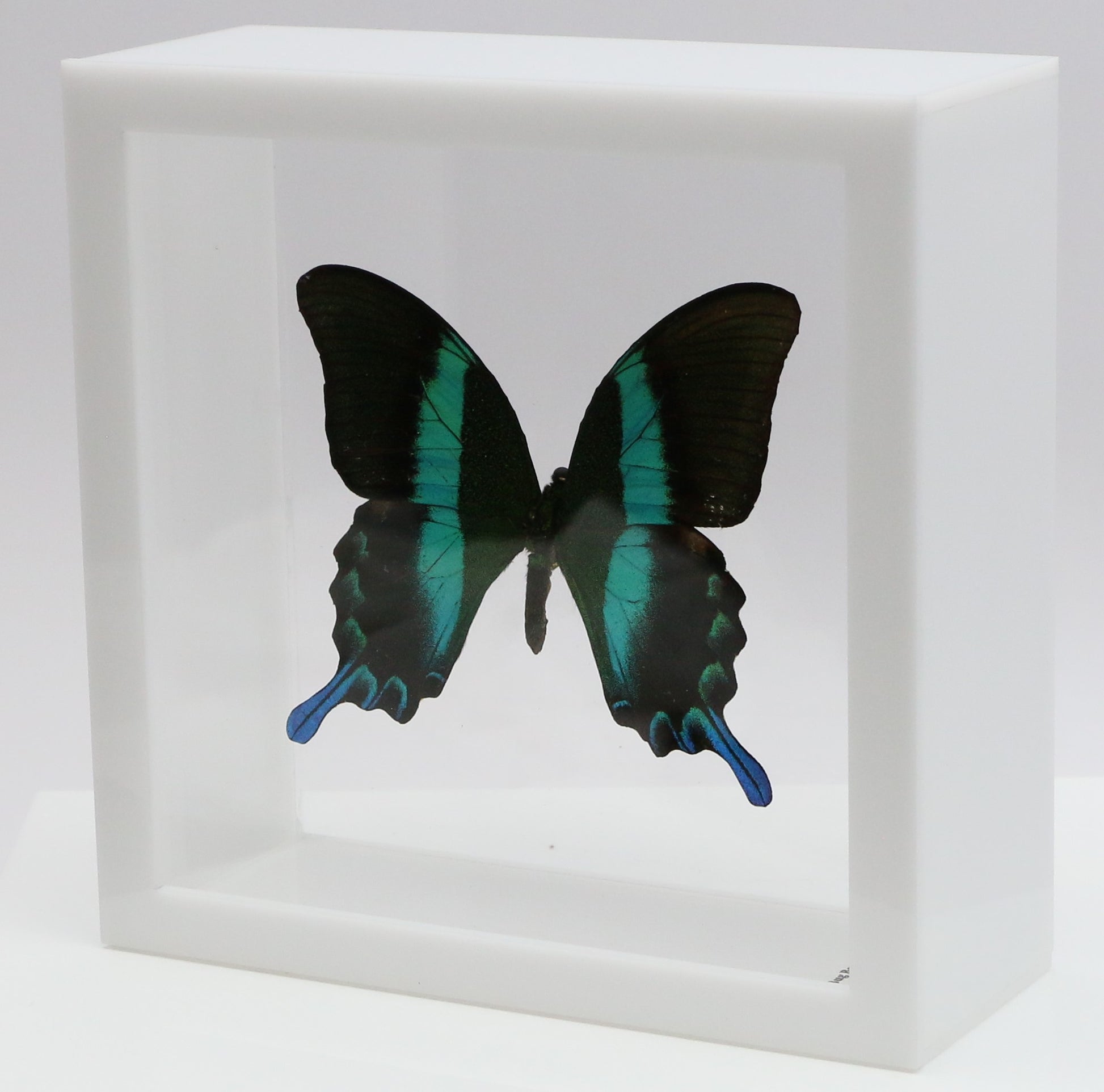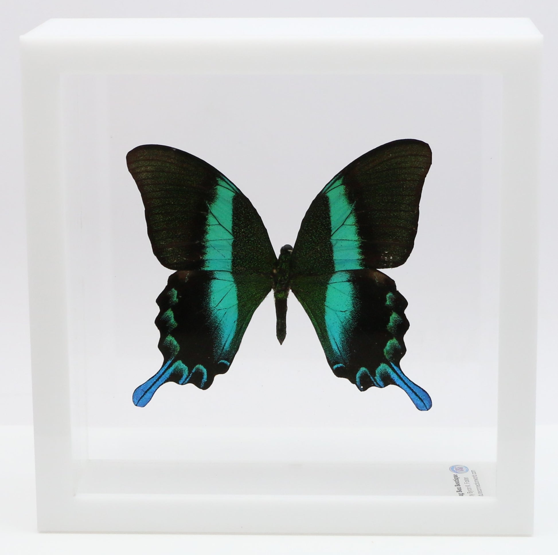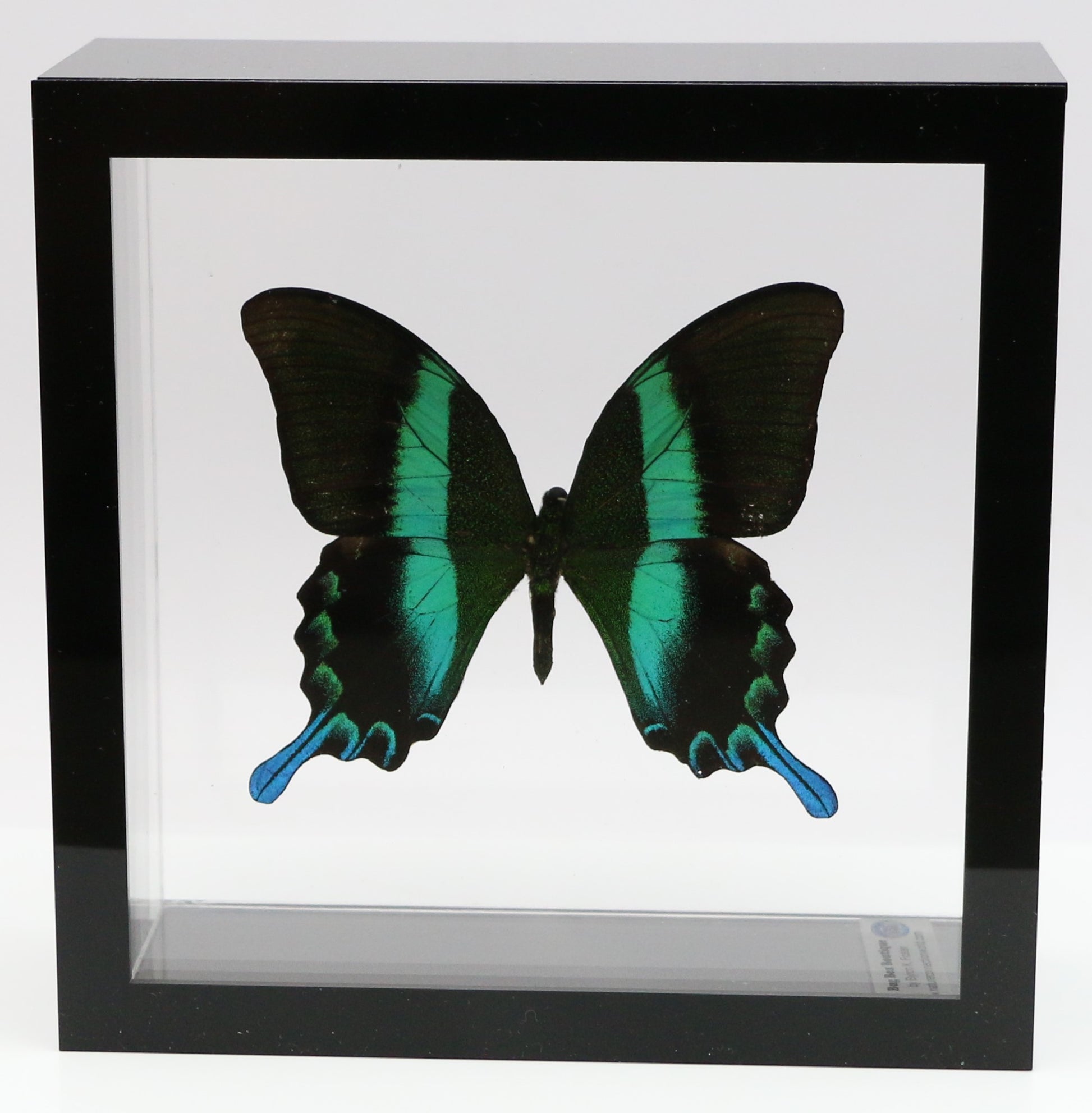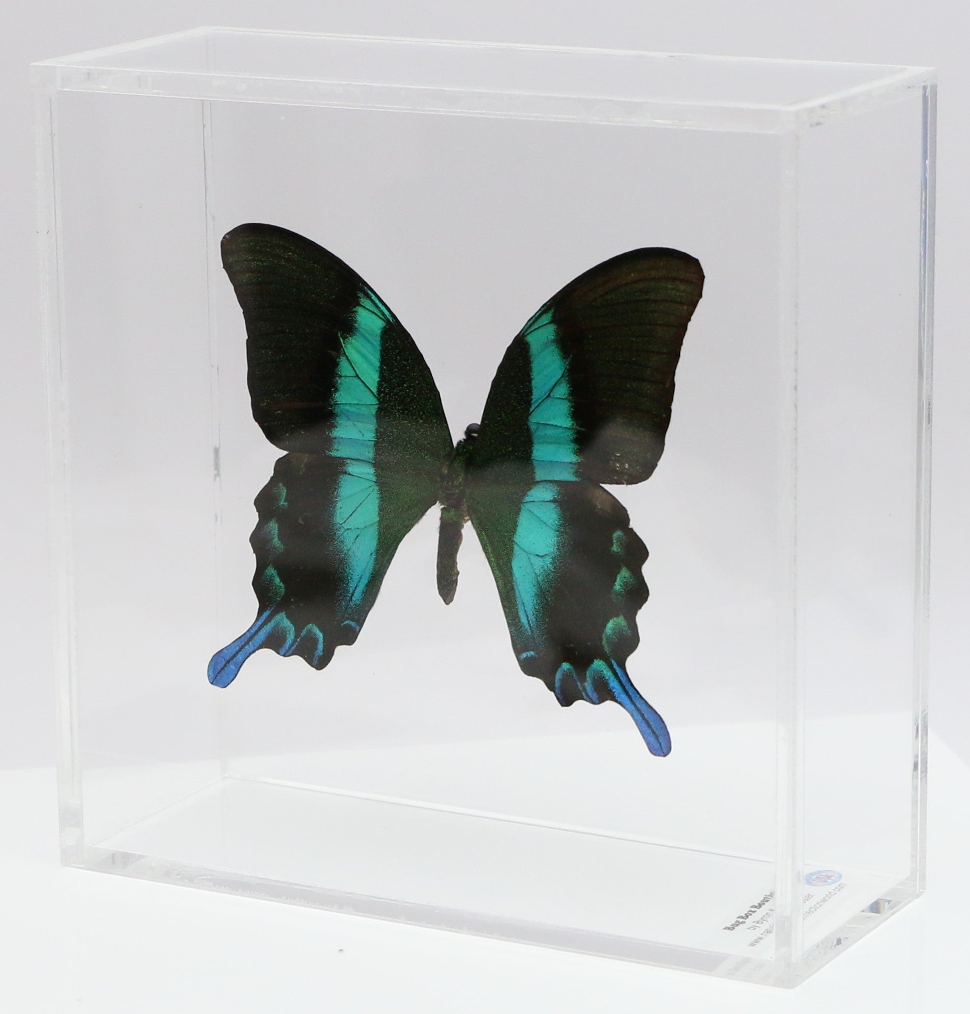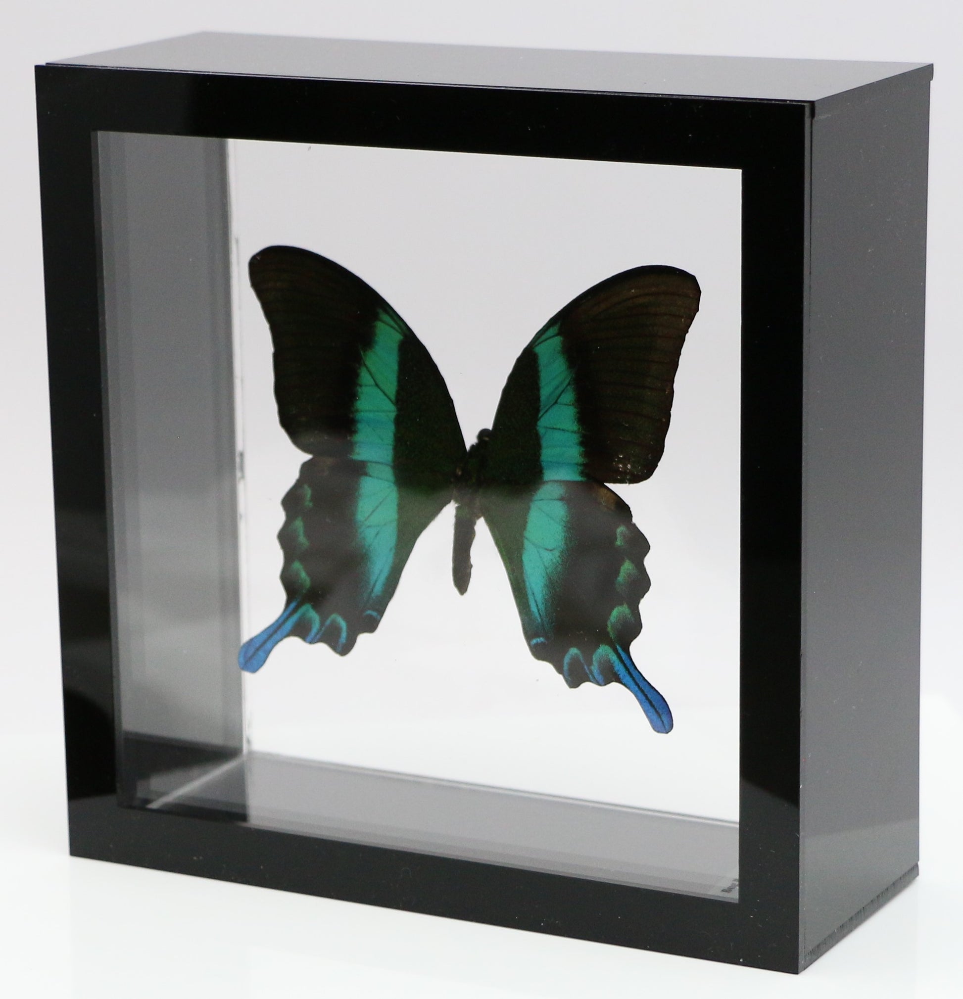 All of our acrylic display boxes are handcrafted at our facilities in Temple, TX. All displays include the species identification information and a packet of Novus acrylic polish. A keyhole hanger is attached so the box can be displayed either by setting on a surface or hanging. All of our specimens are ethically sourced from butterfly exhibits, butterfly farms and suppliers from around the world.
