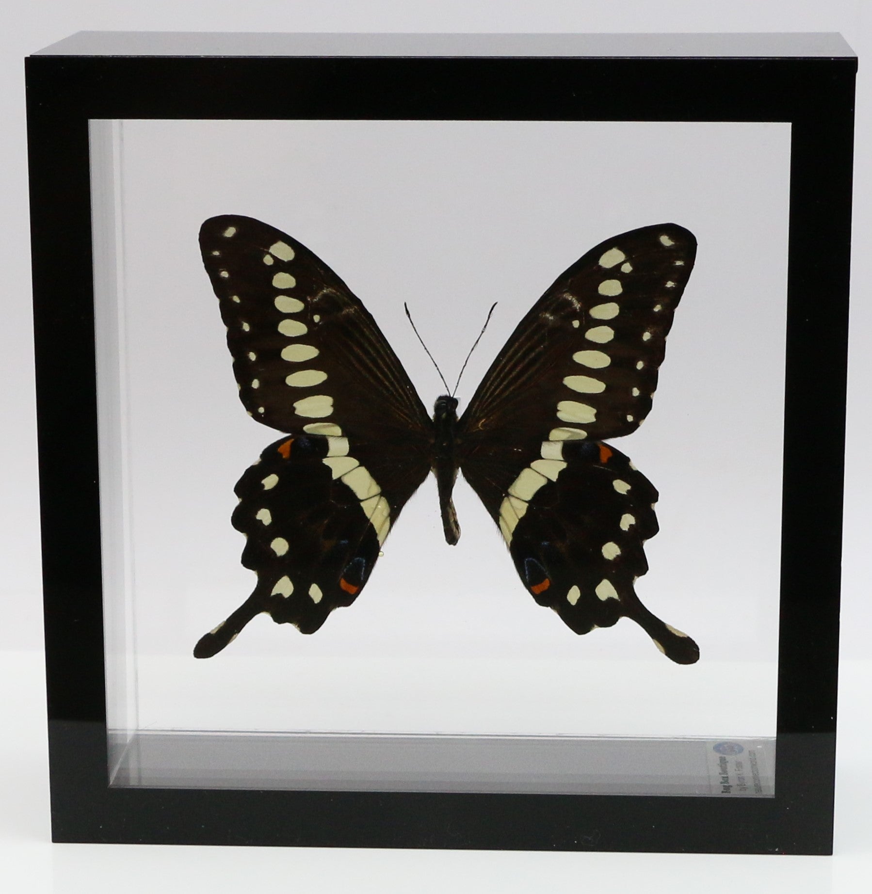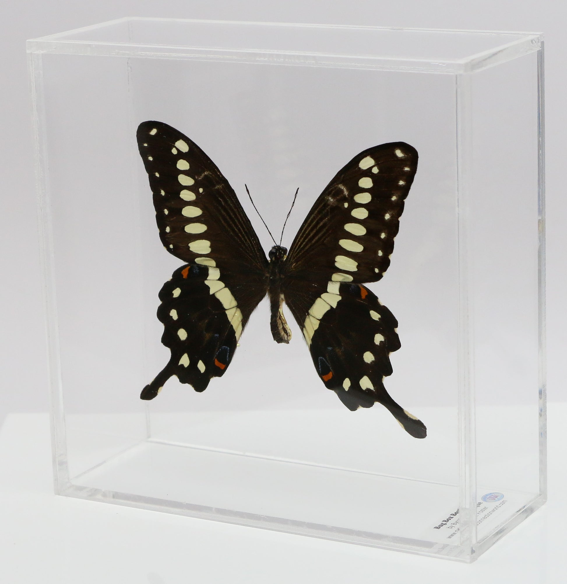 All of our acrylic display boxes are handcrafted at our facilities in Temple, TX. All displays include the species identification information and a packet of Novus acrylic polish. A keyhole hanger is attached so the box can be displayed either by setting on a surface or hanging. All of our specimens are ethically sourced from butterfly exhibits, butterfly farms and suppliers from around the world.