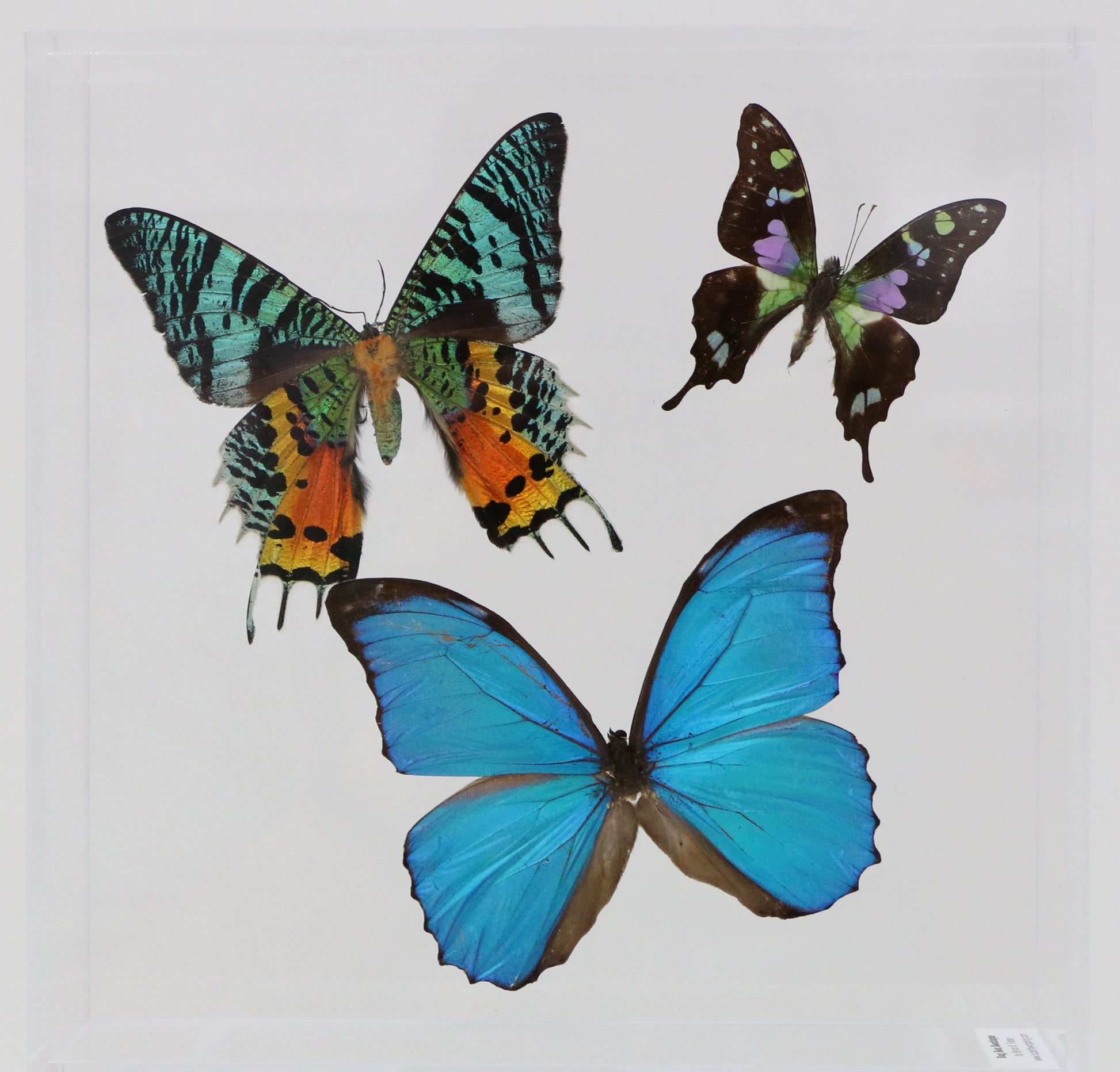 9080801 - Real Butterfly Acrylic Display Box - 8" X 8" - Trio - includes three of the most beautiful Lepidoptera in the world: the Blue Morpho (Morpho menelaus), Purple Spotted Swallowtail (Graphium weiskei) and the Madagascar Sunset Moth (Urania ripheus, Chrysiridia ripheus).