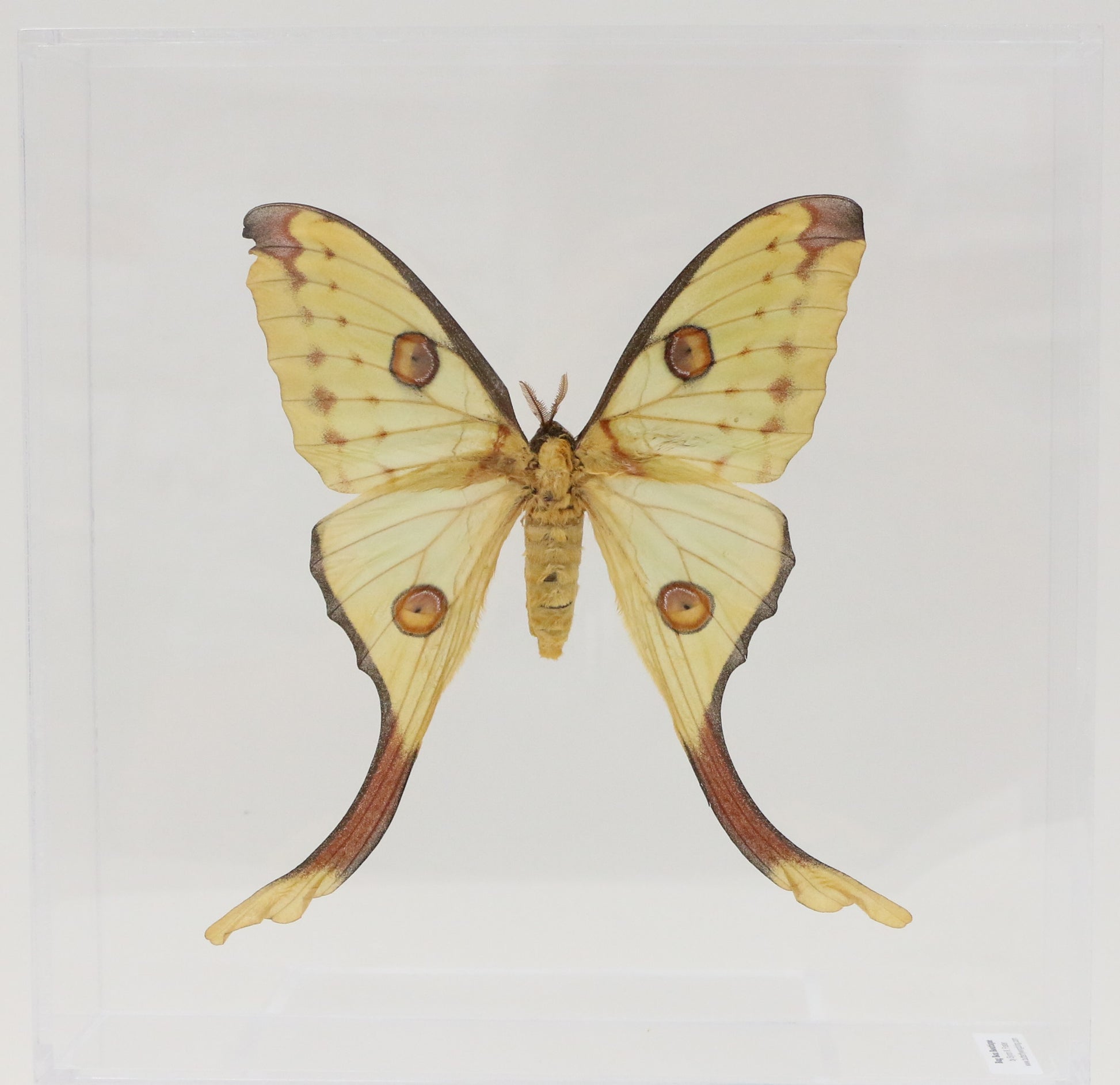 This 10" X 10" acrylic display box features the female Comet Moth ( Argema mittrei ) from Madagascar.