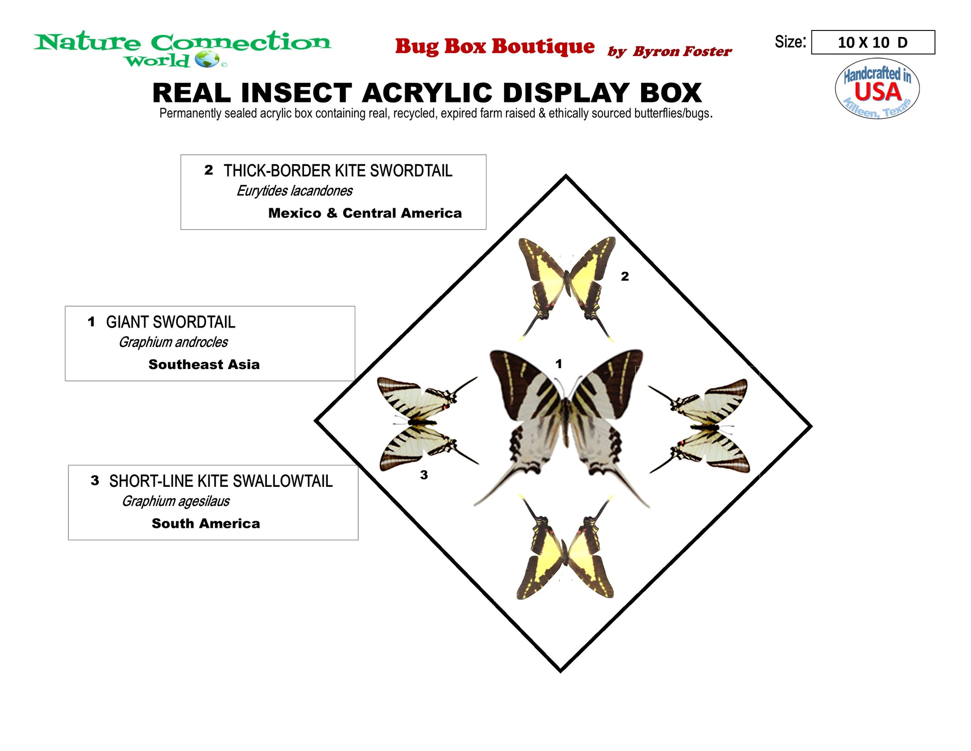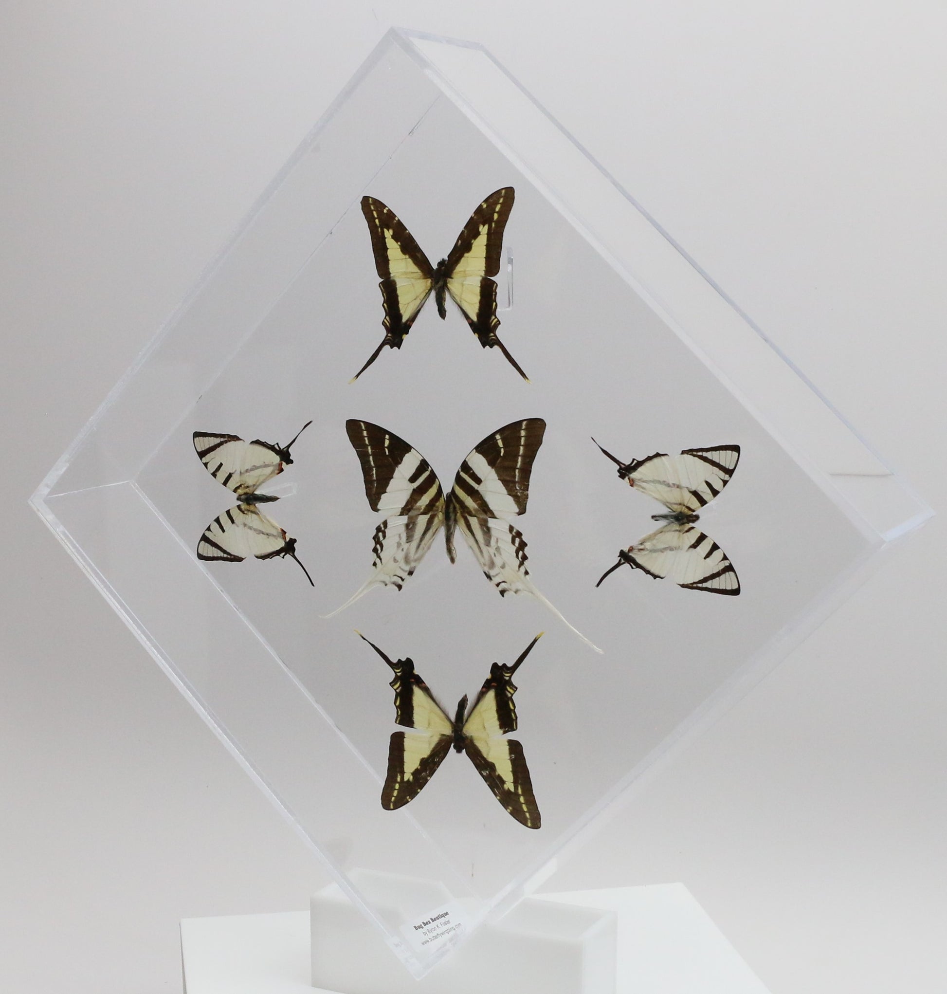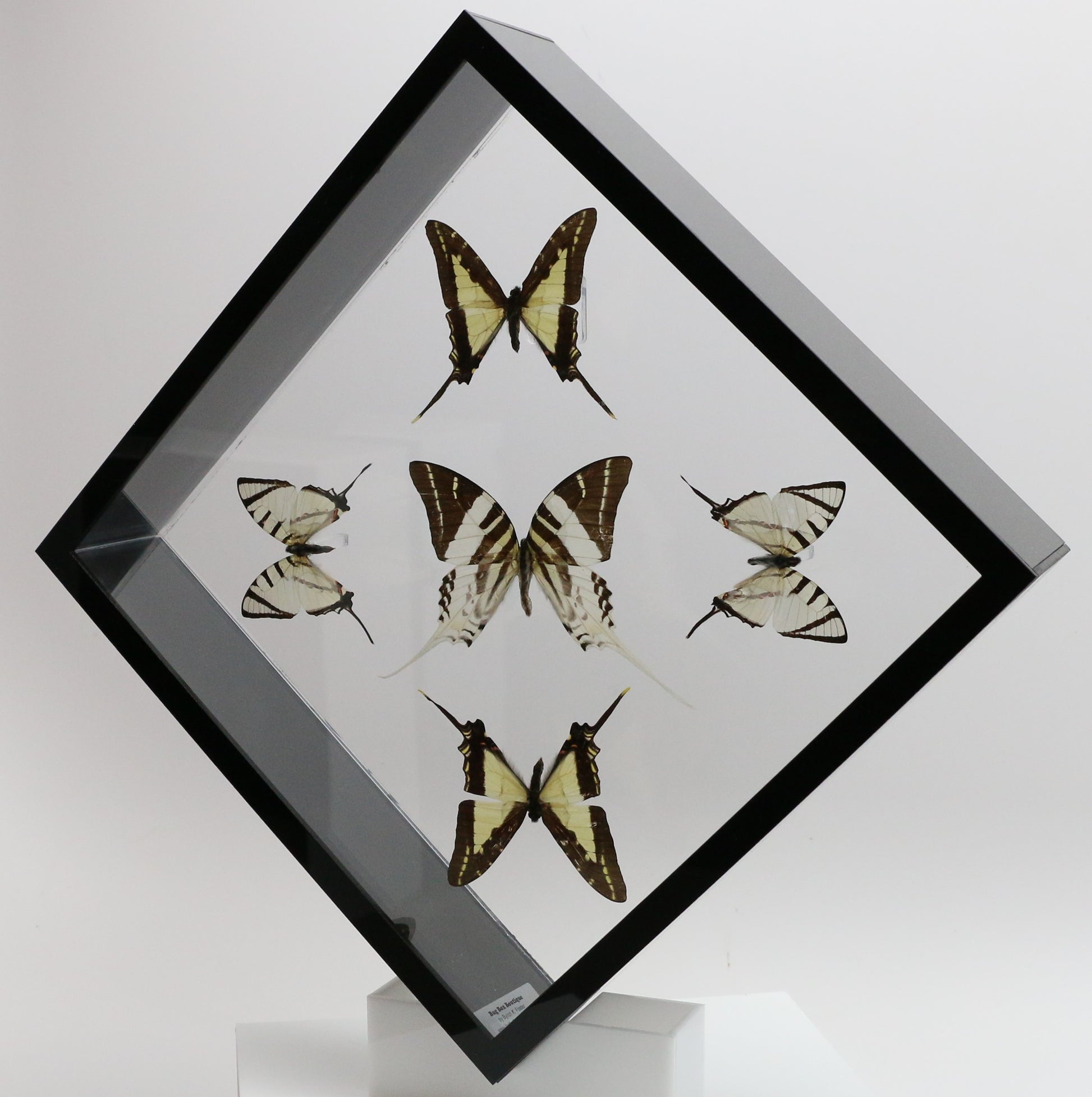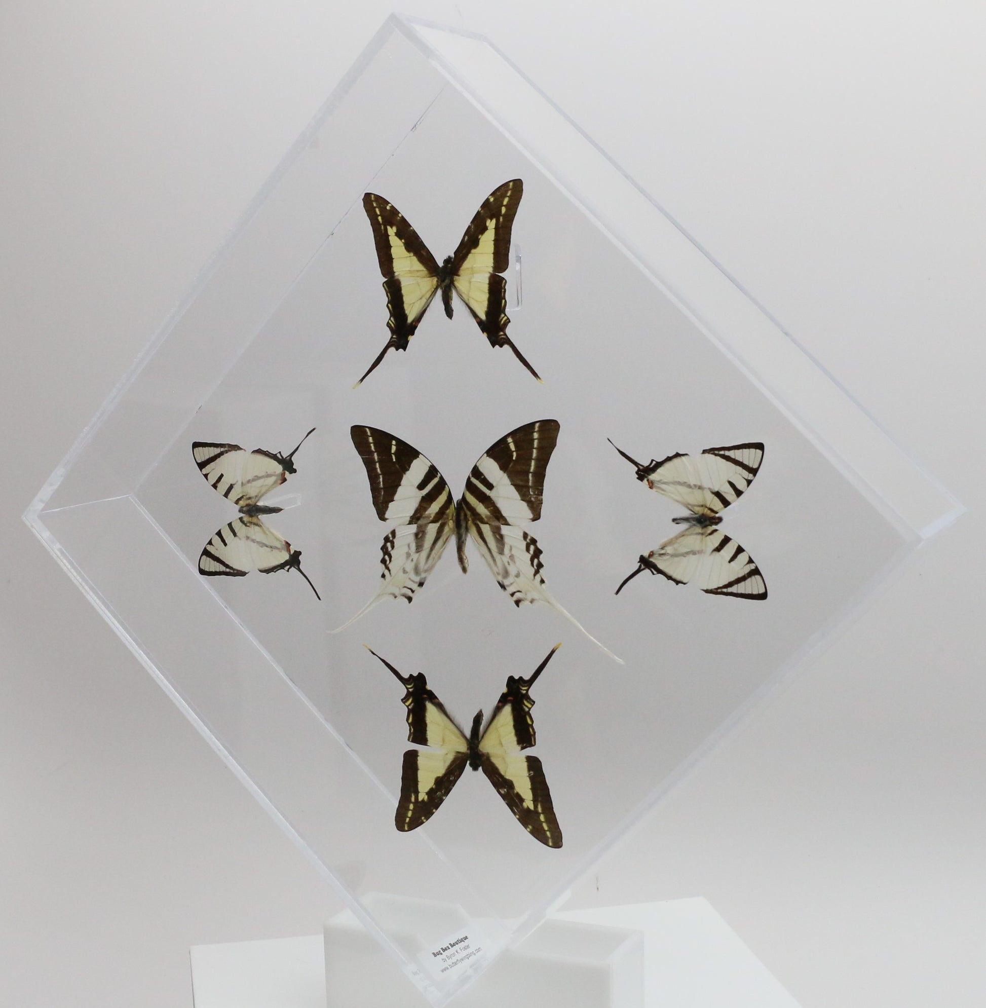 This 10" X 10" acrylic display box features 5 butterflies in a "Sunburst Design". The butterflies are 3 different species of butterflies referred to as the Swordtail Butterflies. They are the Giant Swordtail ( Graphium androcles ) is from SE Asia, the Thick-Border Kite Swordtail ( Eurytides lacandones ) is from Mexico and Central America and the Short-Line Kite Swallowtail (Graphium agesilaus ) from South America.