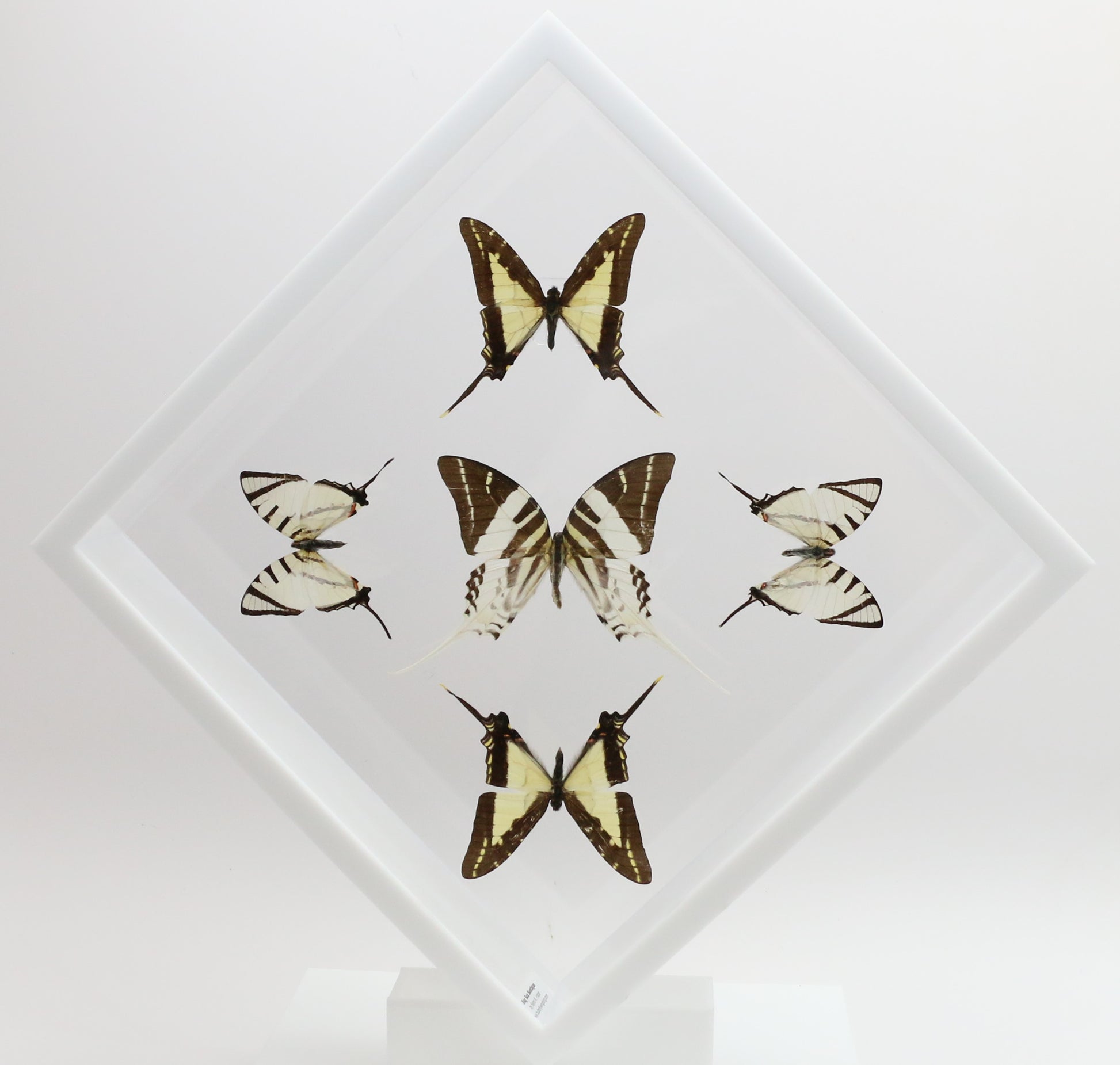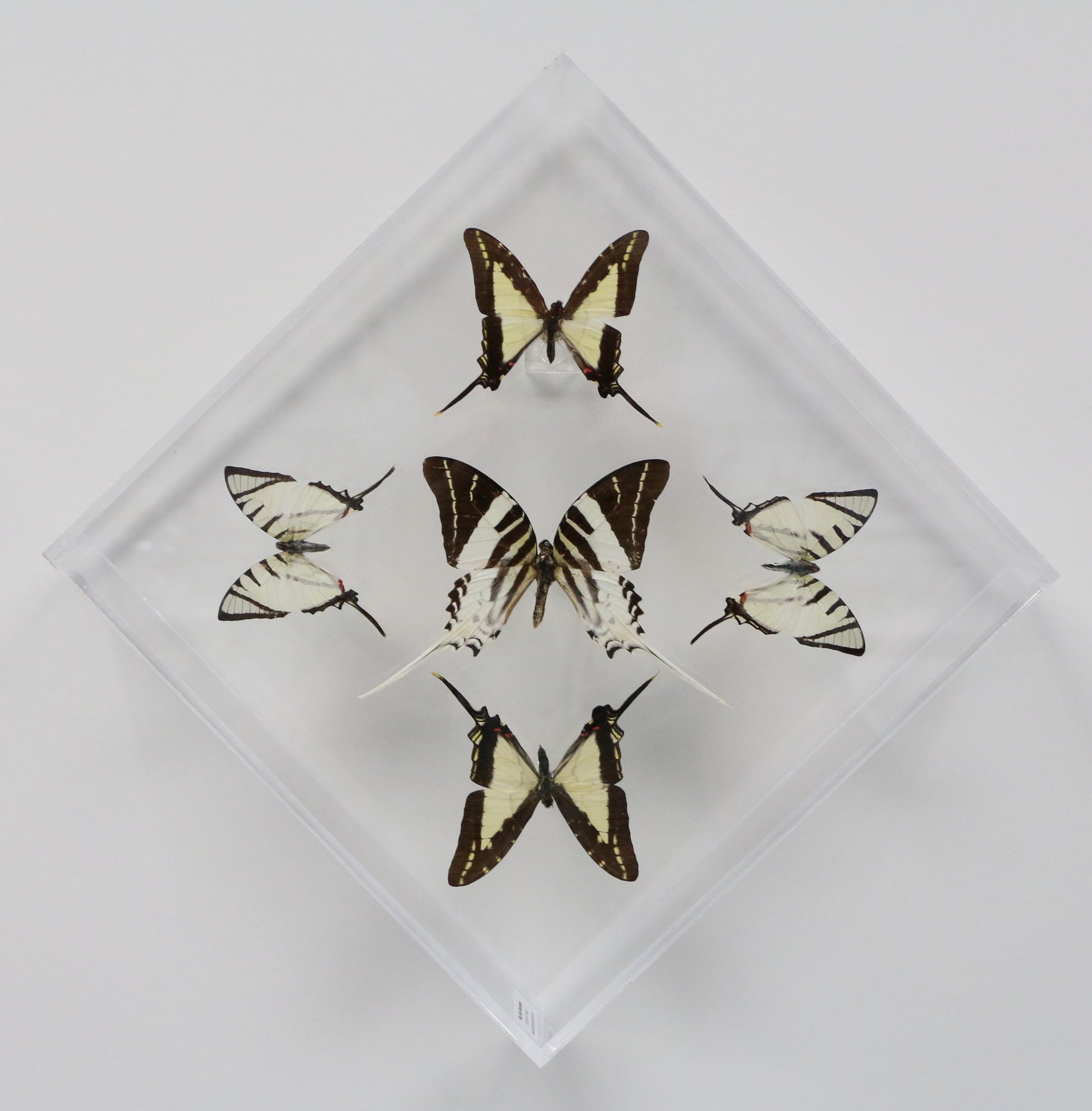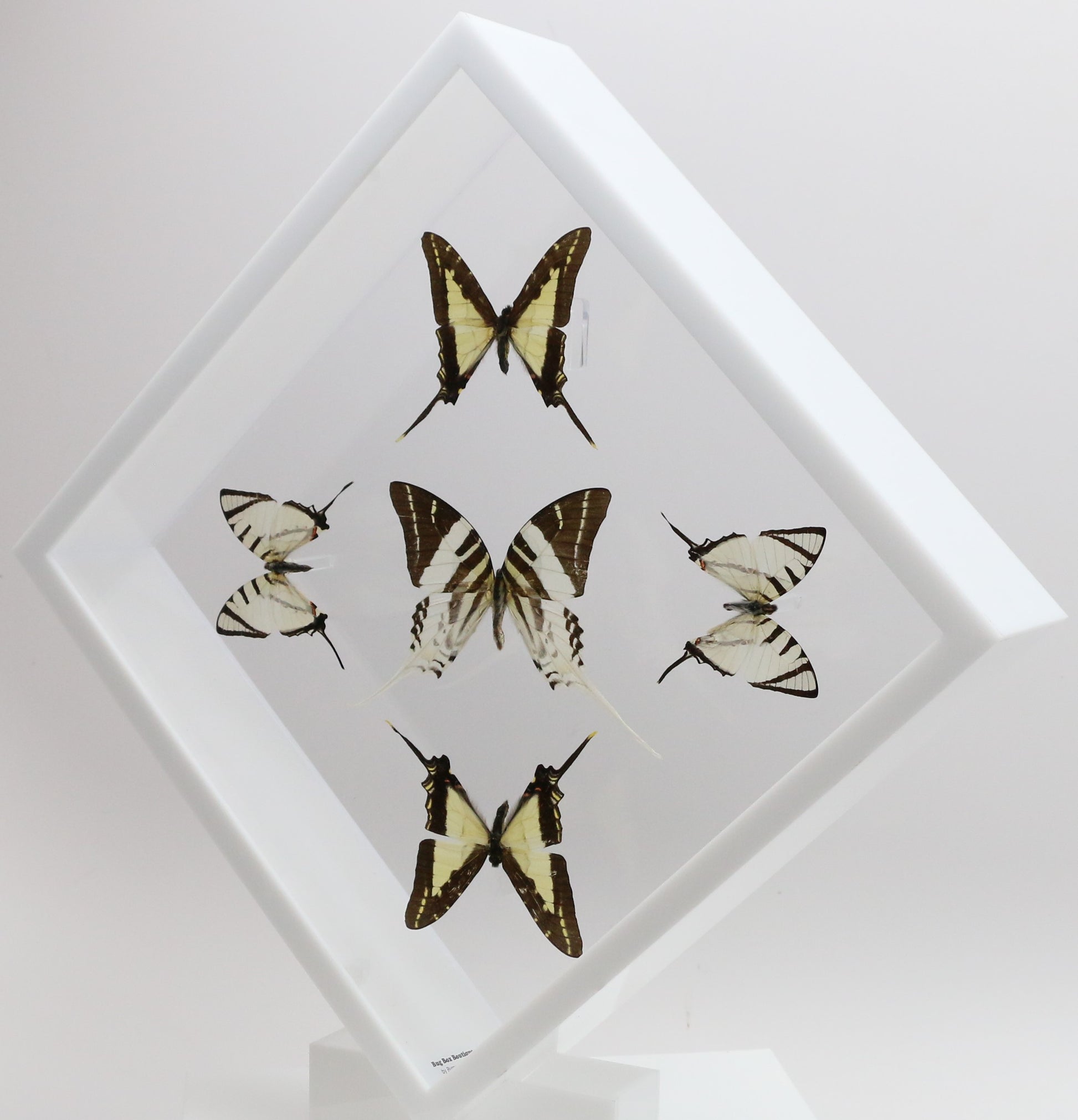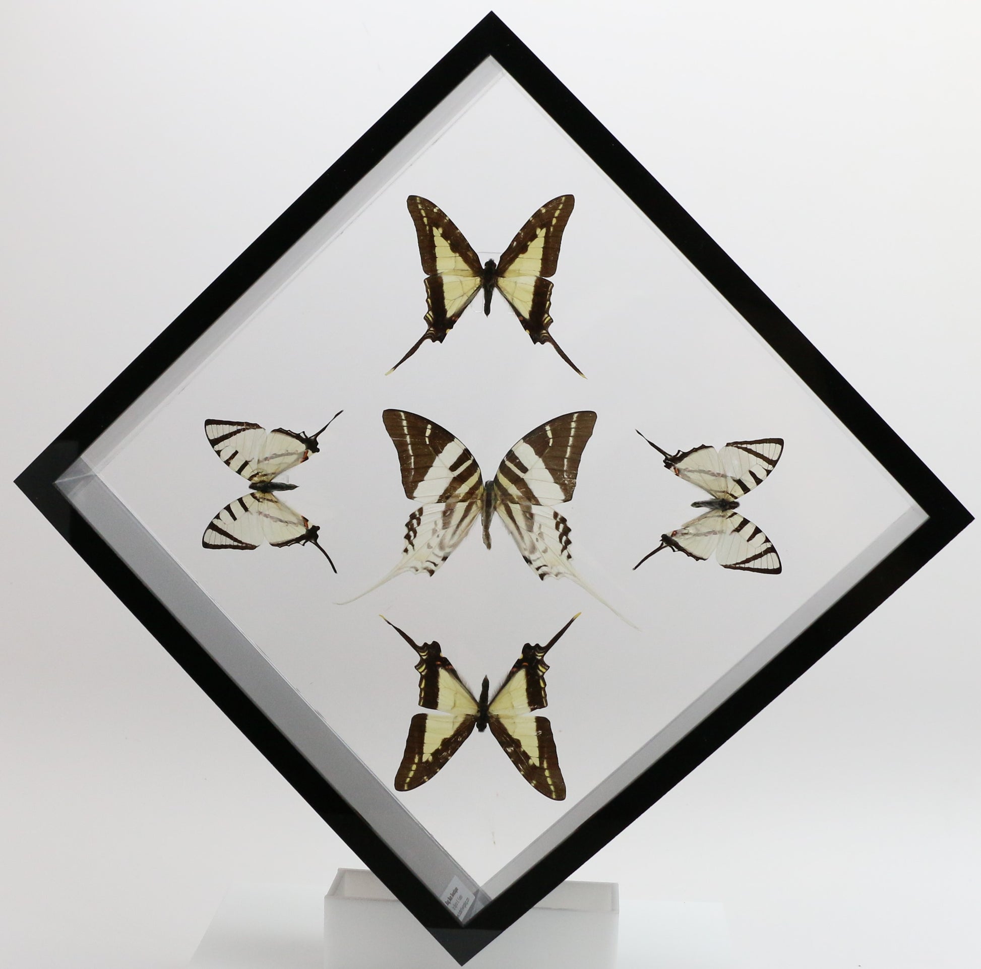 This 10" X 10" acrylic display box features 5 butterflies in a "Sunburst Design". The butterflies are 3 different species of butterflies referred to as the Swordtail Butterflies. They are the Giant Swordtail ( Graphium androcles ) is from SE Asia, the Thick-Border Kite Swordtail ( Eurytides lacandones ) is from Mexico and Central America and the Short-Line Kite Swallowtail (Graphium agesilaus ) from South America.