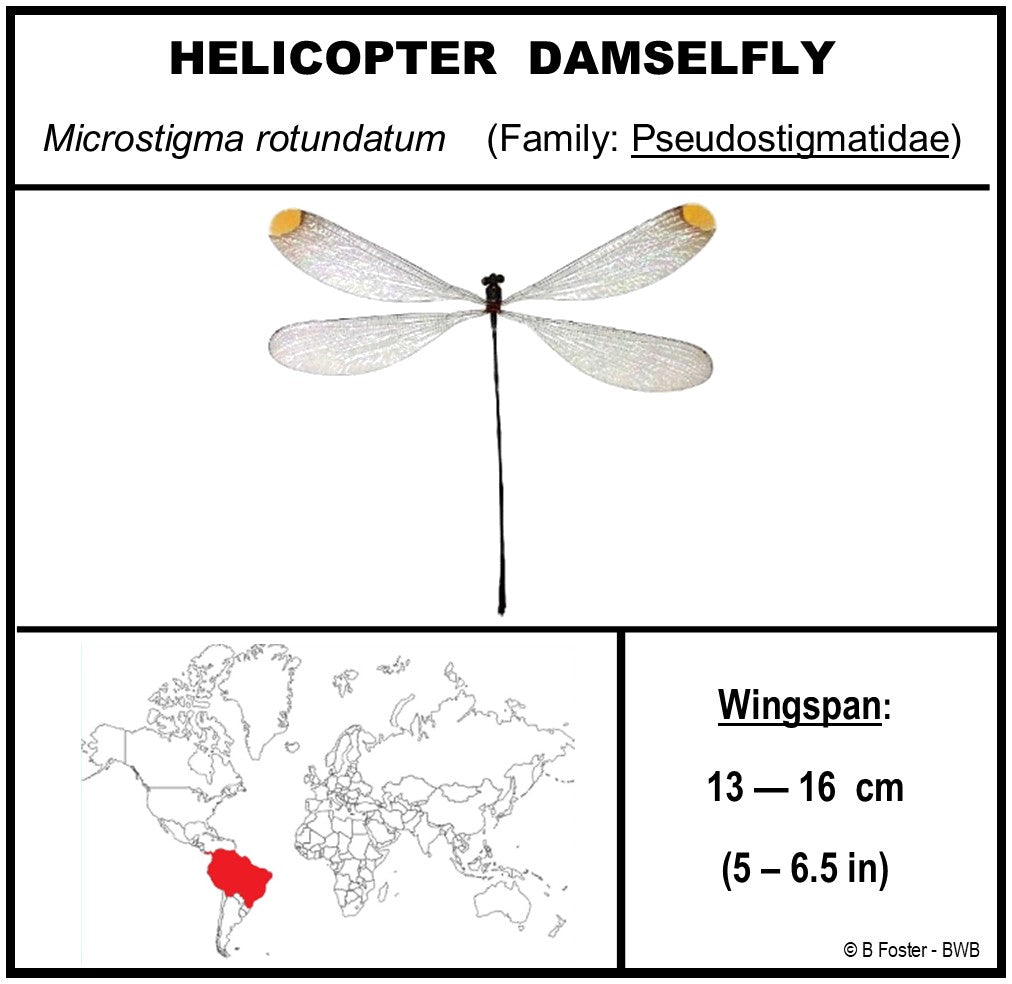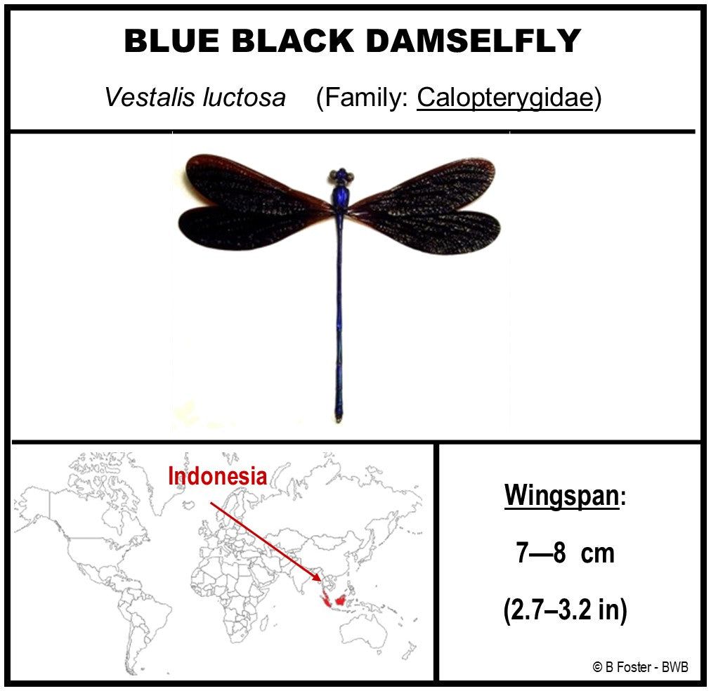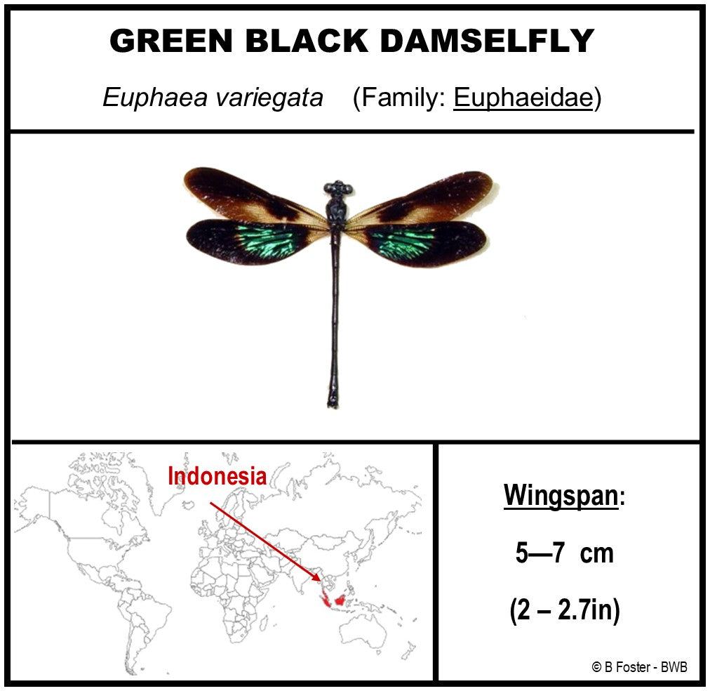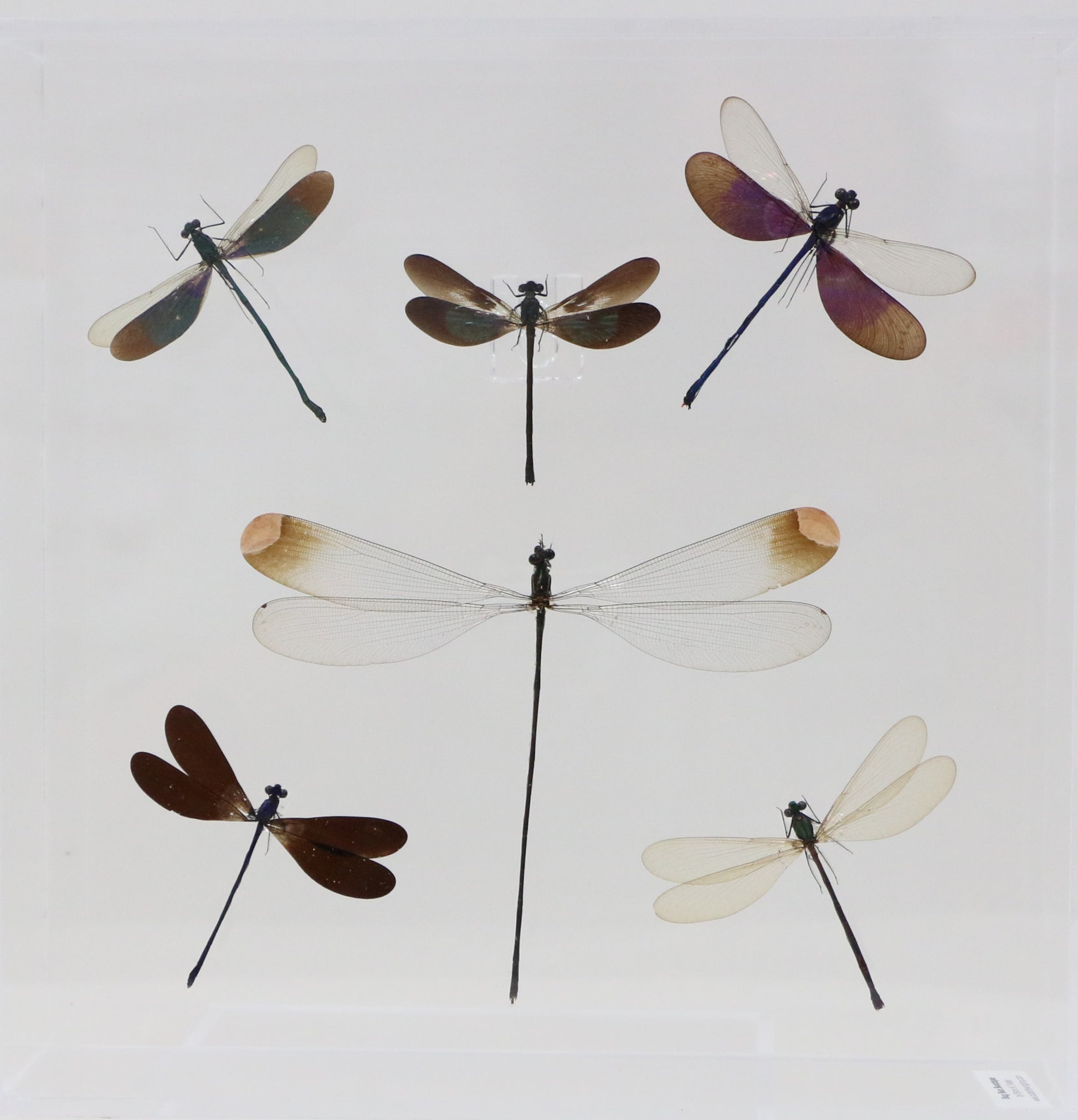 This 10" X 10" acrylic display box gives a look into the many species of damselflies. The 6 Damselflies in this display show how delicate looking and beautiful they are. Refer to the various photos of the species identification cards for more information about each.