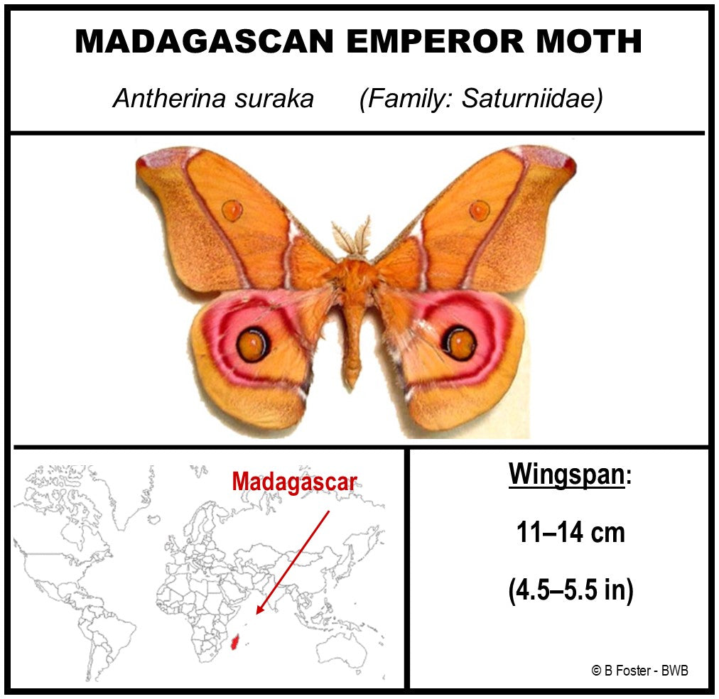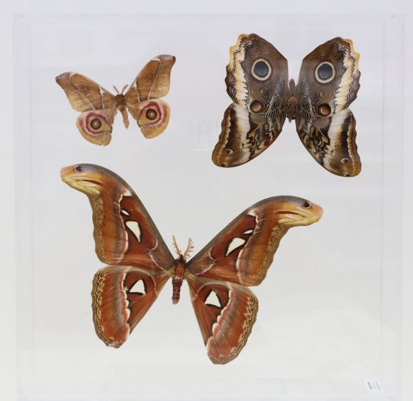 This 12" X 12" acrylic display box is an interesting example of mimicry in nature. The three speciemsn shown have unique appearances that give potential predators pause. The Madagascar Emporer Moth / Suraka Moth ( Antherina suraka ) with its mimicry of the eyes of a Lemur, the Giant Yellow-Edged Owl Butterfly ( Caligo atreus ) with its amazing illusion of an owl and the Atlas Moth ( Attacus atlas ) for the snakehead wing tips.