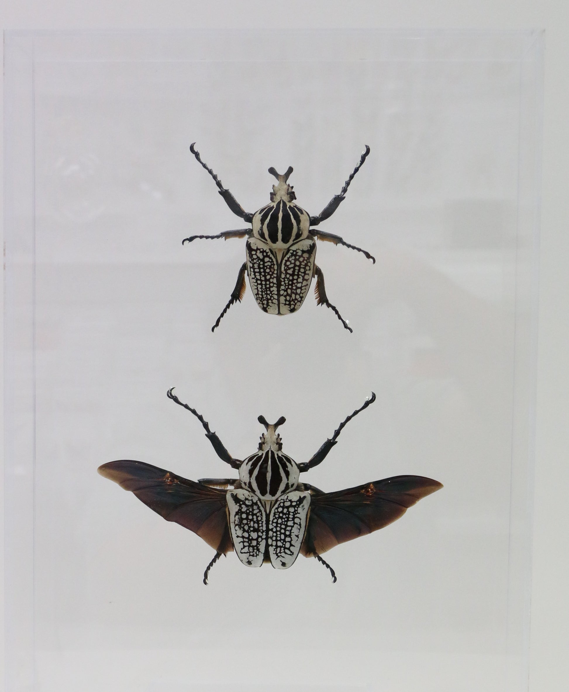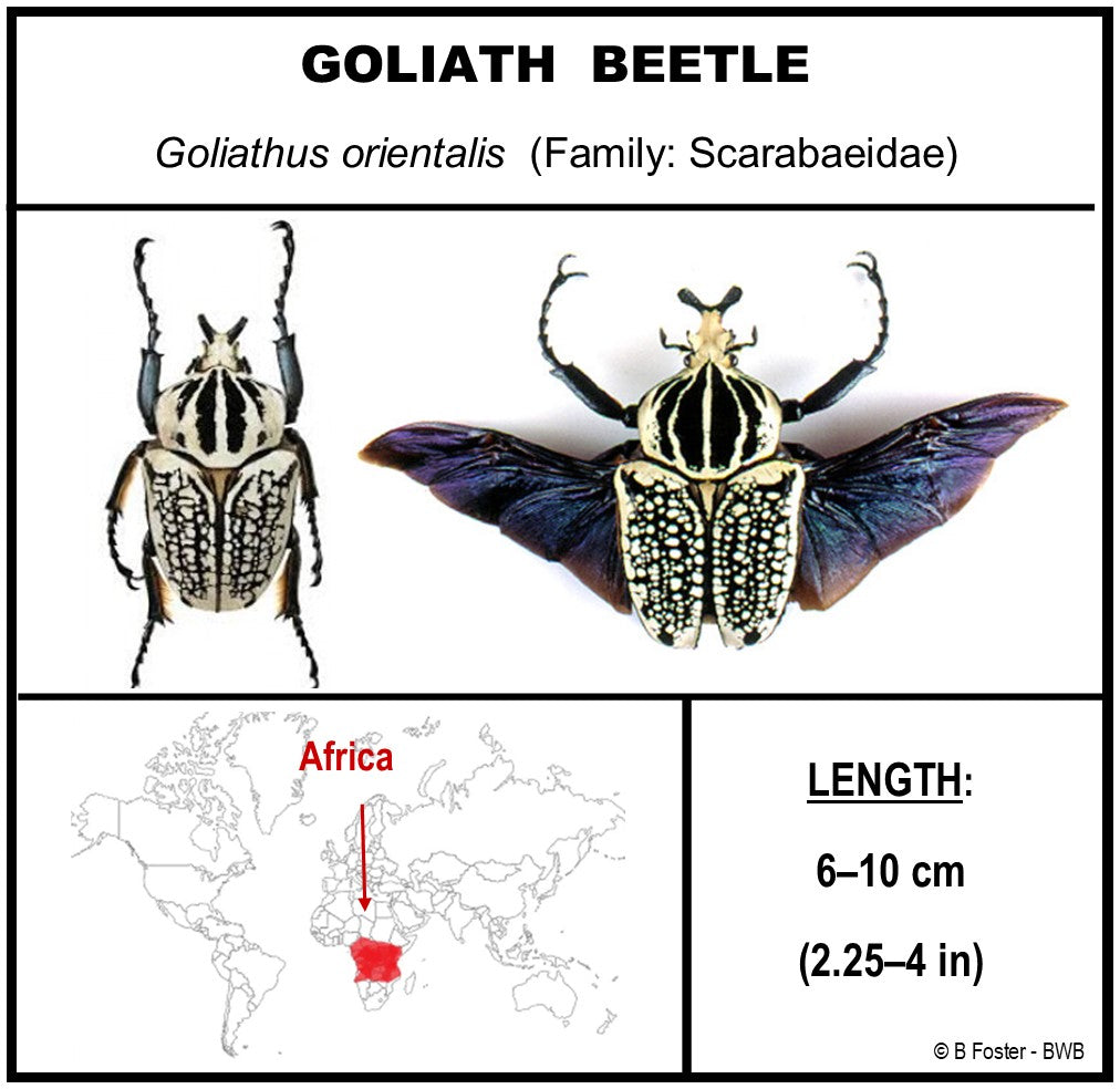 This 12" X 16" acrylic display box features the amazing Goliath Beetle ( Goliathus orientalis ). The two specimens give you the opportunity to study how it looks with its wings open and closed.