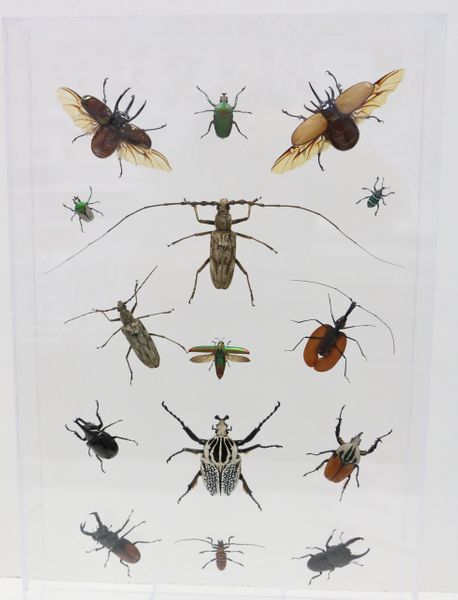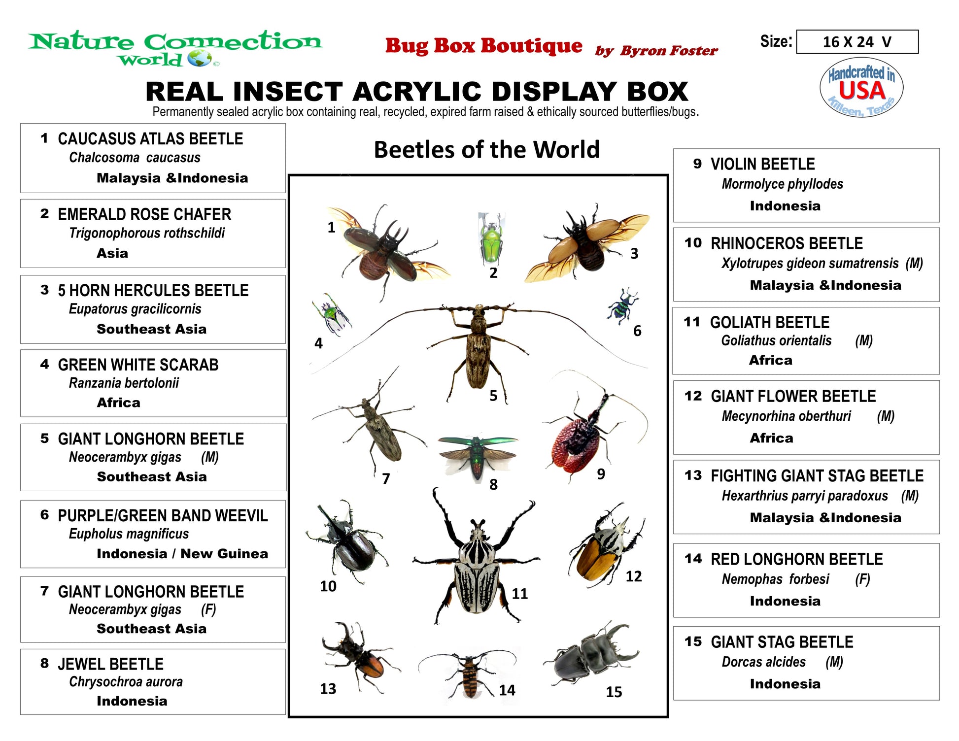 This 16" X 24" acrylic display box features a collection of 15 different Beetles from around the world. Photo #2 shows the identification card that identifies all the specimens in this display.