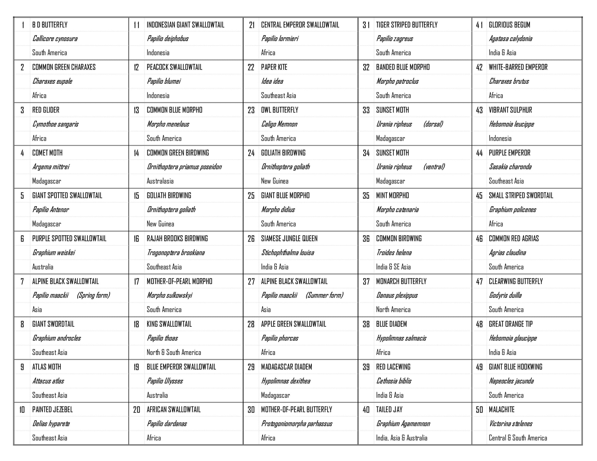 Papilio, Morpho, Ornithoptera, Delias, Hebomoia, Graphium, Hypolimnas, Charaxes, Attacus, Argema, Urania