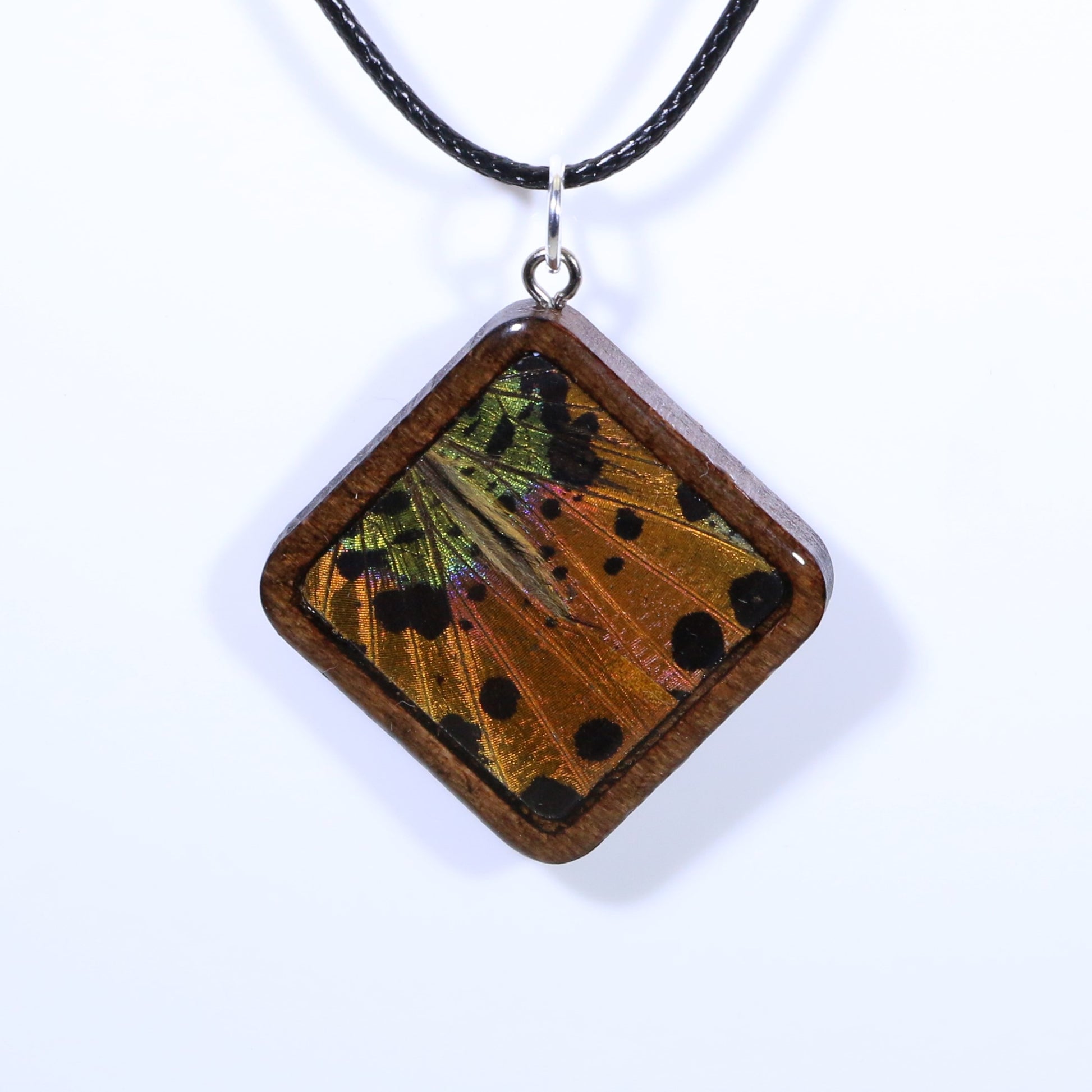 52912 - Real Butterfly Wing Jewelry - Pendant - Dark Wood - Large - Diamond Shape - Sunset Moth - Orange