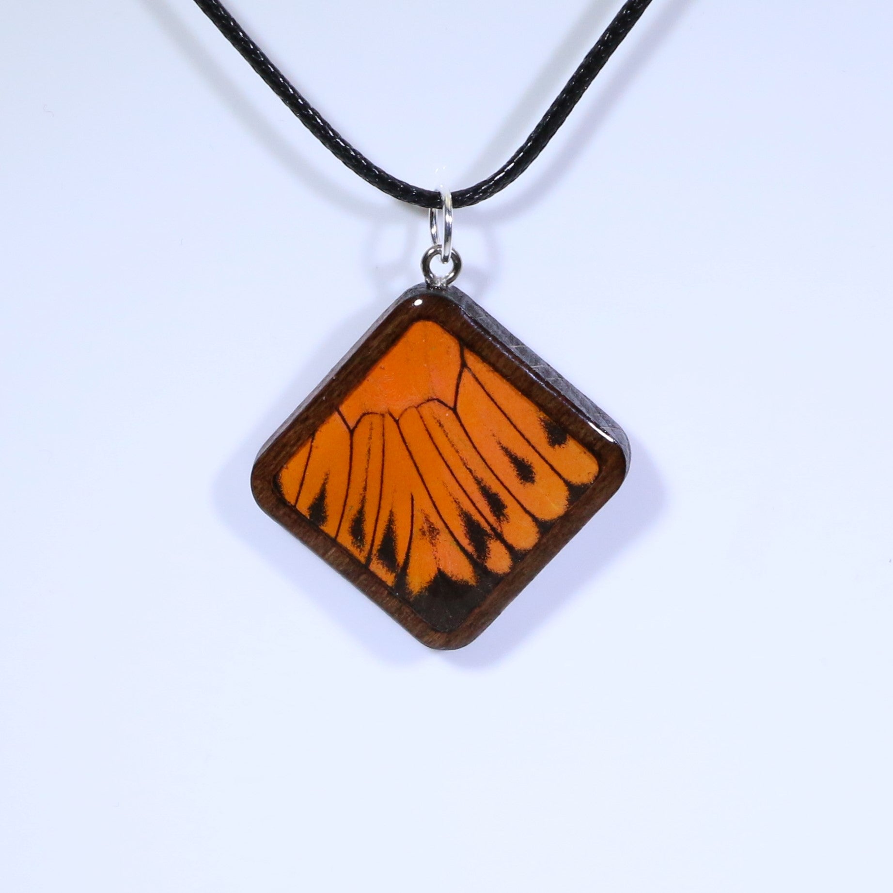 52915 - Real Butterfly Wing Jewelry - Pendant - Dark Wood - Large - Diamond Shape - Hebomia - Orange