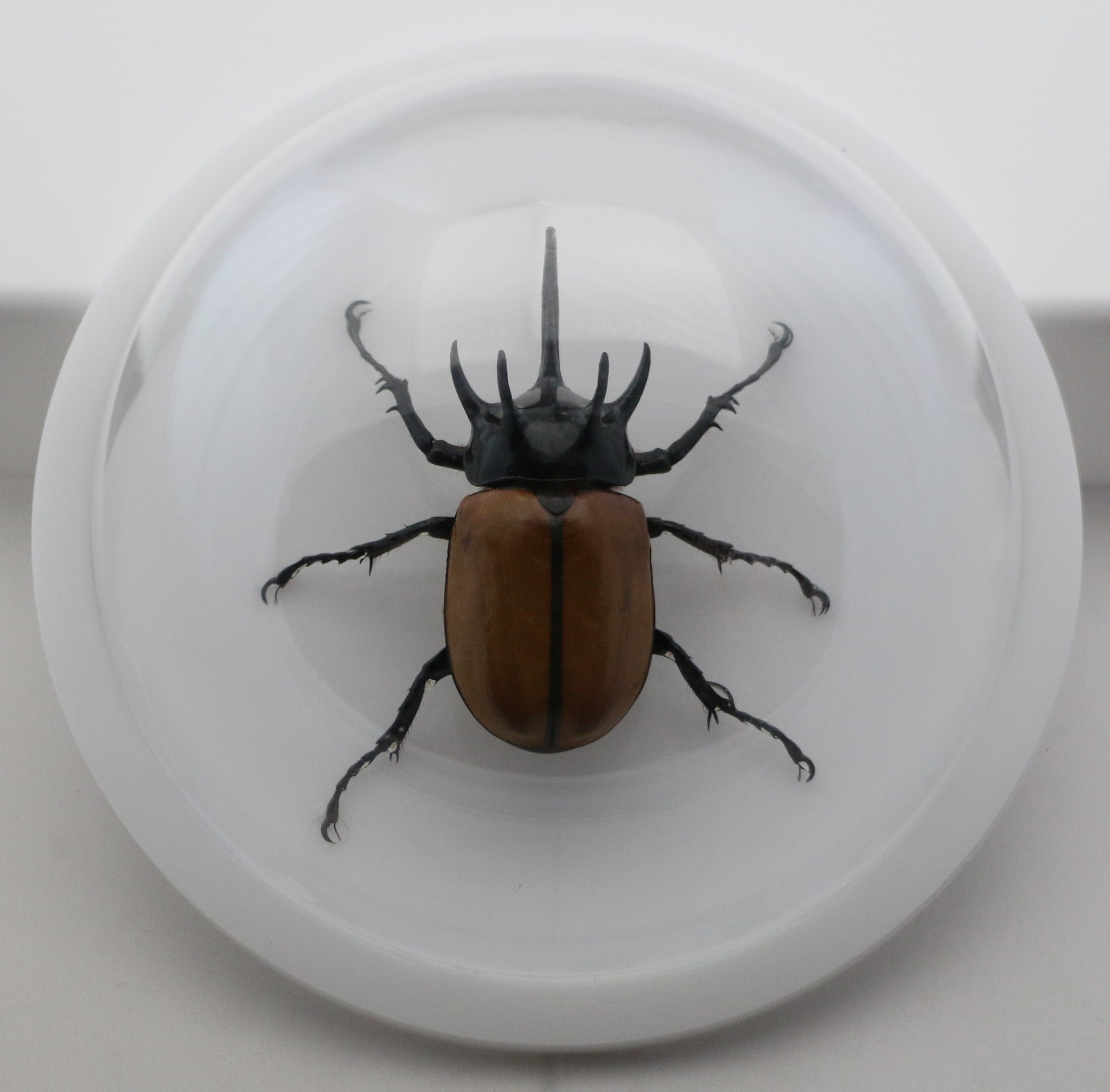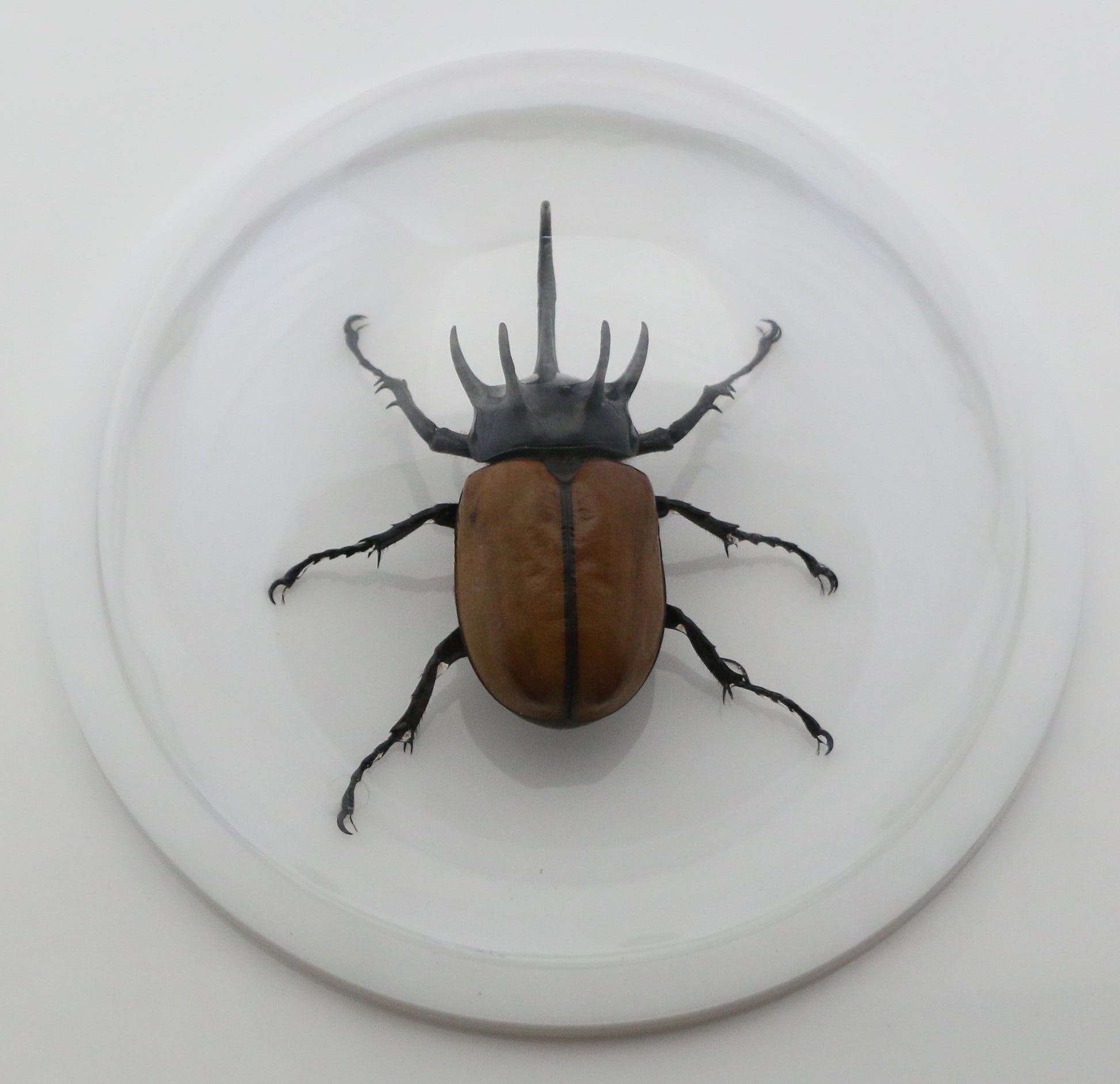 The beetle is mounted inside our extra-large (156mm = 6.2 inch diameter) clear acrylic dome on a black acrylic base (177mm = 7 inch diameter). The domes are great for displaying on desks or tables, but also can easily be hung on a wall.
