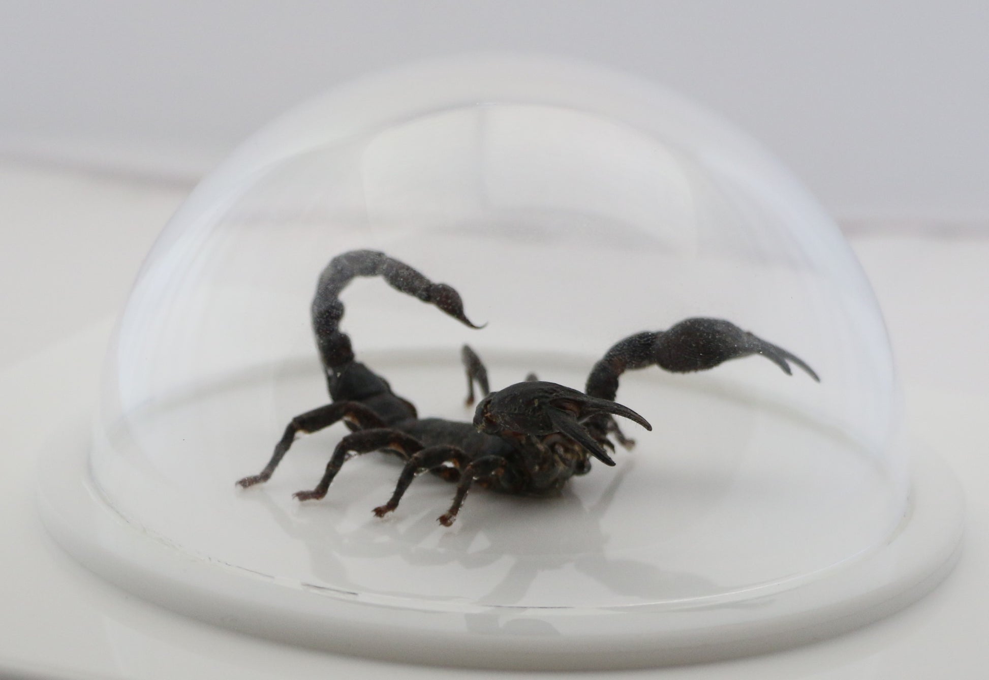 The scorpion is mounted inside our extra-large (156mm = 6.2 inch diameter) clear acrylic dome on a black acrylic base (177mm = 7 inch diameter). The domes are great for displaying on desks or tables, but also can easily be hung on a wall.