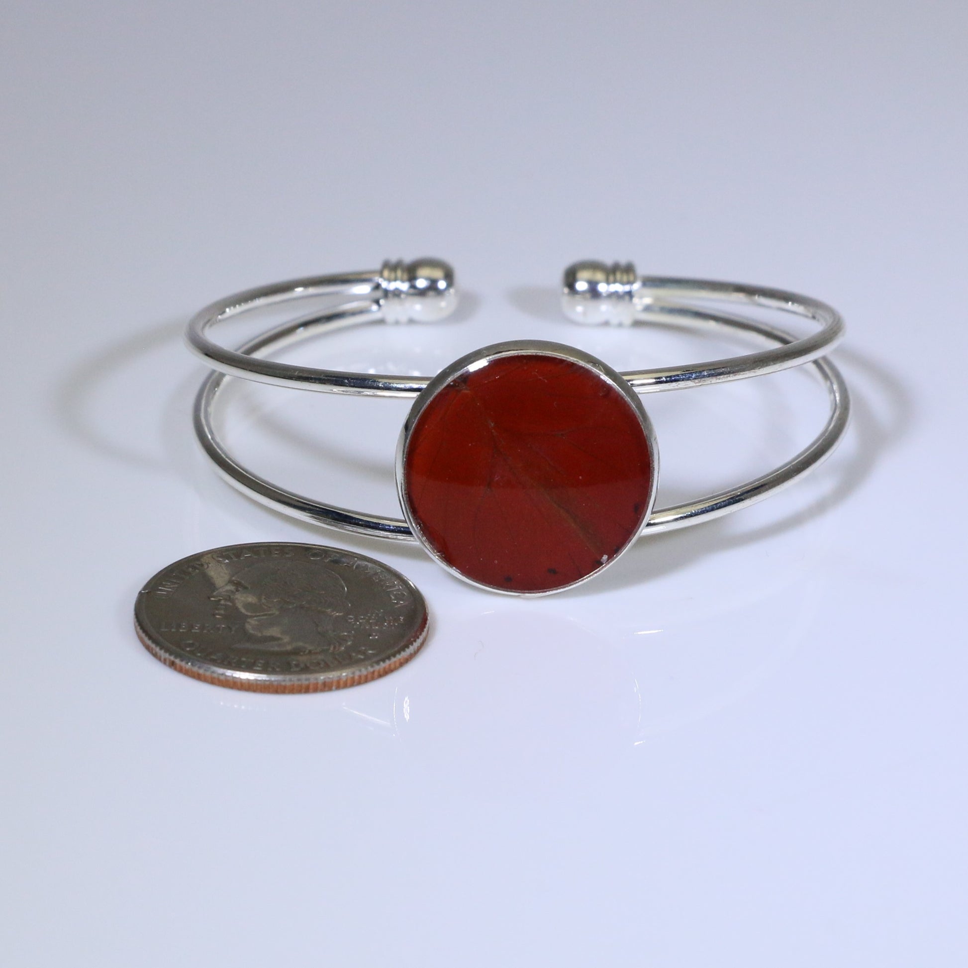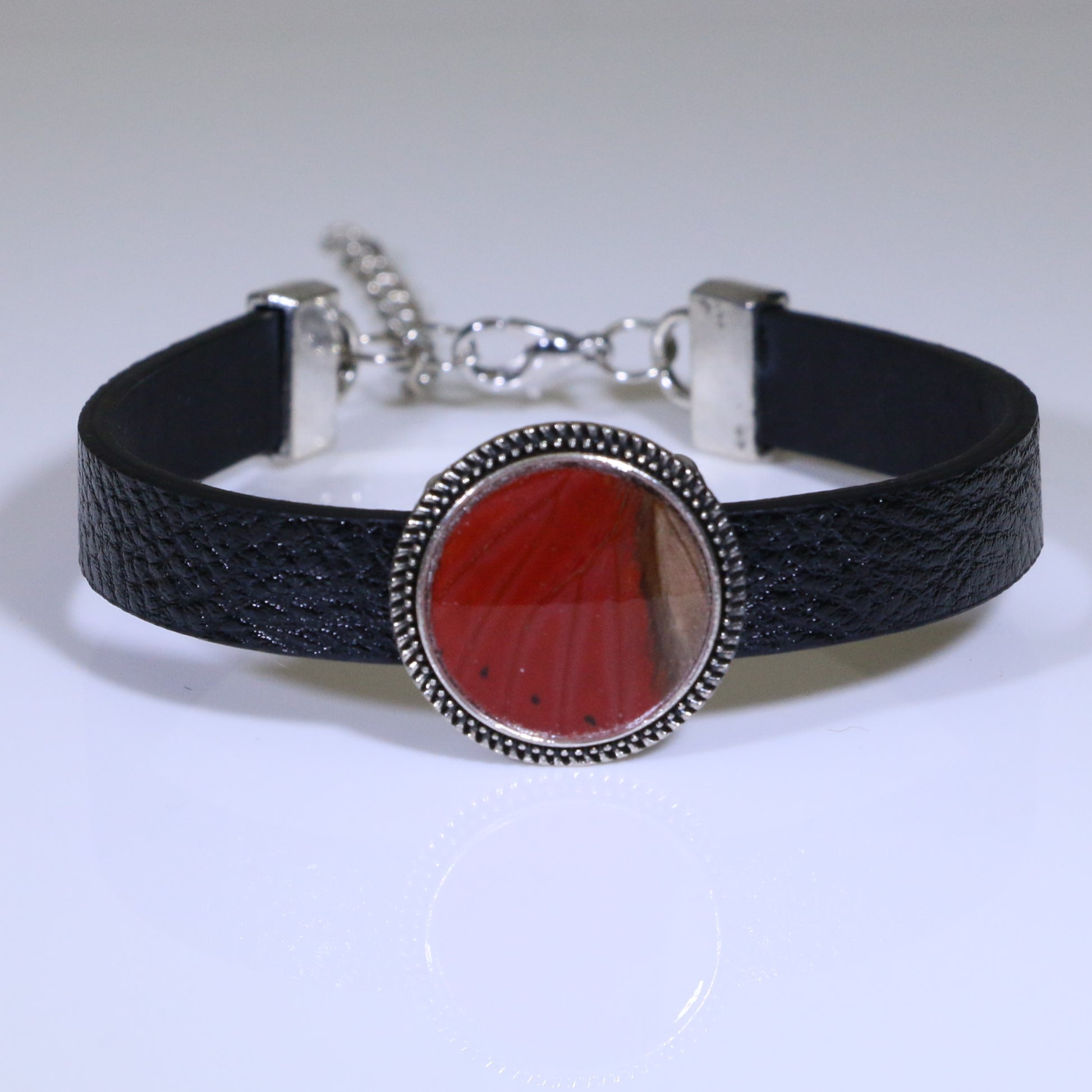 The bracelets are a nice jewelry accessory that really shows off the red glider wing piece. The white or black bracelet you see has a setting that measures 18mm. The bands are leather. The silver-plated cuff bracelet features a 20mm setting.